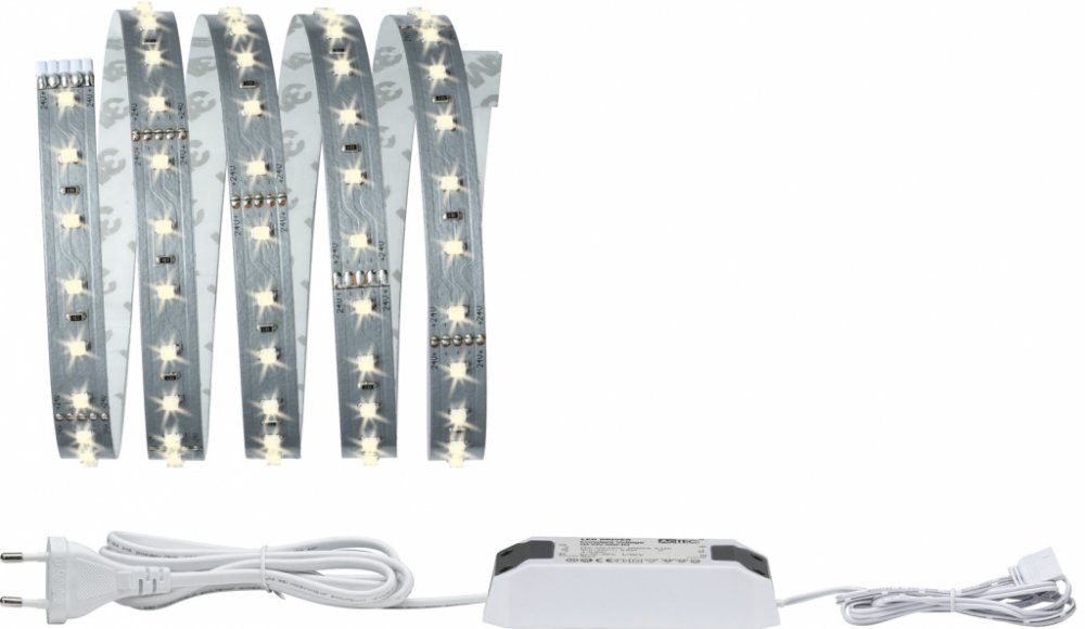Základní sada řady Paulmann MaxLED 500 bez povrchové úpravy obsahuje teplý bílý LED pásek s odpovídajícím předřadníkem a zástrčkou. Jas lze regulovat pomocí regulátoru stmívání/přepínání (k dispozici samostatně). Vhodné pouze do suchých vnitřních prostor. Jednoduchá, nekomplikovaná instalace díky samolepicímu podkladu - Kompletní sada včetně pásku a LED transformátoru - Možnost rozšíření - Možnost stmívání pomocí regulátoru stmívání/přepínání MaxLED (není součástí dodávky) - Samolepicí podklad, jednoduchý zásuvný systém pro snadnou instalaci a možnost zkrácení podle potřeby - Flexibilní materiál pro použití na rovných nebo zakřivených plochách - S 5kolíkovou zástrčkou pro snadné připojení pásků