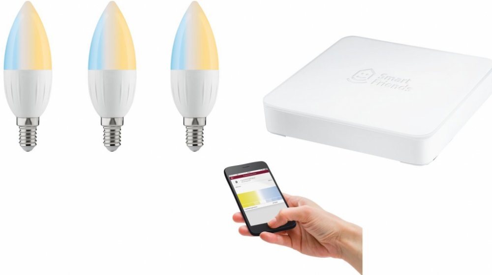 Praktická sada Smart Home Starter Set Candela usnadňuje zahájení vaší inteligentní domácnosti. Obsahuje Smart Friends Box jako centrální rozhraní a tři svíčkové žárovky TunableWhite. Teplota barev může být plynule nastavena mezi 2 700 Kelvinů (teplé bílé relaxační světlo) a 6 500 Kelvinů (denní bílé pracovní světlo)