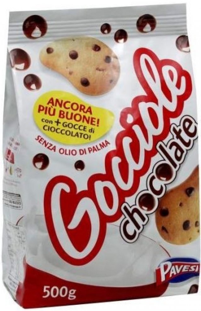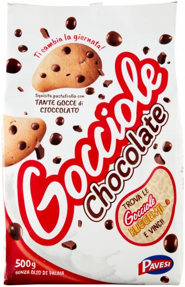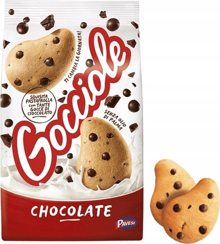 Sušenky s kousky čokolády.Začněte den tím nejlepším možným způsobem se vší chutí a energií Gocciole Pavesi.Sprcha mnoha čokoládových lupínků ve vynikajícím drobivém křehkém těstě: to je tajemství Gocciole Pavesi.