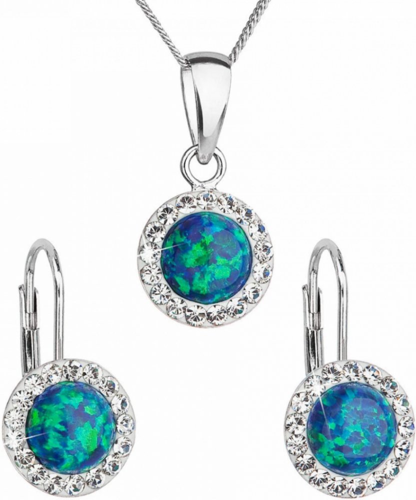 Stříbrná souprva obsahuje visací náušnice a řetízek s přívěskem. Šperky jsou vyrobeny ze stříbra ryzosti 925/1000, které prošlo povrchovou úpravou rhodiem. Rhodium chrání šperk proti zčernání, zežloutnutí i poškrábání. Přívěšek i náušnice jsou zdobeny zeleným syntetickým opálem, který je navíc olemován malými třpytivými Preciosa krystaly v bílé barvě. Náušnice mají zapínání na klapku. Jelikož šper...