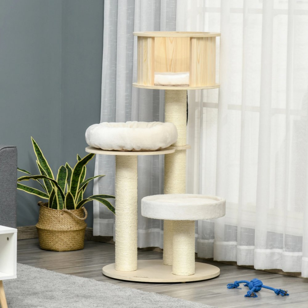 Dopřejte svému šplhacímu stromu vynikající příležitost k odpočinku a broušení drápků s tímto skvělým šplhacím stromem od PawHut! Tento prolézačkový strom, který se skládá z prostorného domečku, dvou pohodlných plošin na ležení a tří robustních šplhacích stromů, nabízí vaší kočce nespočet příležitostí k naplnění jejího herního instinktu a odpočinku. Navíc díky mnoha vyčnívajícím škrábacím plochám bude váš nábytek konečně v bezpečí před škrábanci!Popis: Dětské hřiště pro kočky je vyrobeno z kvalitního a odolného materiálu:škrabadla ze sisalu jsou vynikající pro broušení drápků a chrání tak váš nábytek před poškrábáním✔ Prostorný domeček a útulné plochy na ležení poskytují pohodlí✔ Součástí balení je několik měkkých polštářků (lze prát)✔ Víceúrovňová konstrukce uspokojí touhu vašeho mazlíčka po šplhání✔ Vhodné pro kočky s hmotností nižší než 5 kg✔ Vyžaduje montážTechnical data:✔ Barva: přírodní+krémová✔ Materiál: borovicové dřevo, vícevrstvá deska, sisal, plyš✔ Celkové rozměry: 59,5D x 59,5Š x 122V cm✔ Rozměry základny: 59,5L x 59,5W cm✔ Rozměry středové plošiny: 59,5L x 45W cm✔ Rozměry domečku: Ø45 x 27,4V cm✔ Rozměry postele: Ø41 x 8V cm✔ Rozměry škrabadla: Ø10 cm✔ Doporučená hmotnost zvířete: do 5 kgRozsah dodávky:✔1 x škrabadlo✔1 x návod k použitíŠKRÁBACÍ A ODPOČINKOVÉ CENTRUM: Tento víceúrovňový kočičí strom je vybaven třemi kočičími stromy, dvěma pohodlnými plošinami na ležení a prostorným vyvýšeným domečkem a nabízí kočkám mnoho příležitostí k broušení drápků, lenošení a odpočinku.ŠETŘÍ VAŠE NÁBYTEK: Toto škrabadlo je bohatě pokryto sisalem a nabízí vaší kočce četné příležitosti k broušení drápků a chrání tak váš nábytek před škrábanci.STABILNÍ A BEZPEČNÉ: Toto škrabadlo pro kočky je vyrobeno z masivního borovicového dřeva, takže je robustní, šetrné k domácím mazlíčkům a představuje bezpečné místo pro hraní a odpočinek.MĚKKÉ A POHODLNÉ: Velké škrabadlo a lehací plošiny jsou měkce polstrované a nabízejí vašemu domácímu tygříkovi obzvlášť pohodlnou příležitost ke spontánnímu zdřímnutí. V neposlední řadě také dodá vašemu obydlí nový, dekorativní prvek!INFORMACE O VÝROBKU: Celkové rozměry: 59,5 D x 59,5 Š x 122 V cm. Vhodné pro kočky do 5 kg. Vyžaduje montáž.