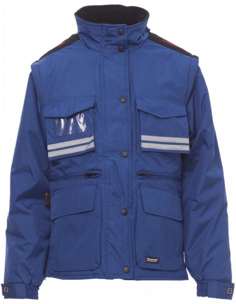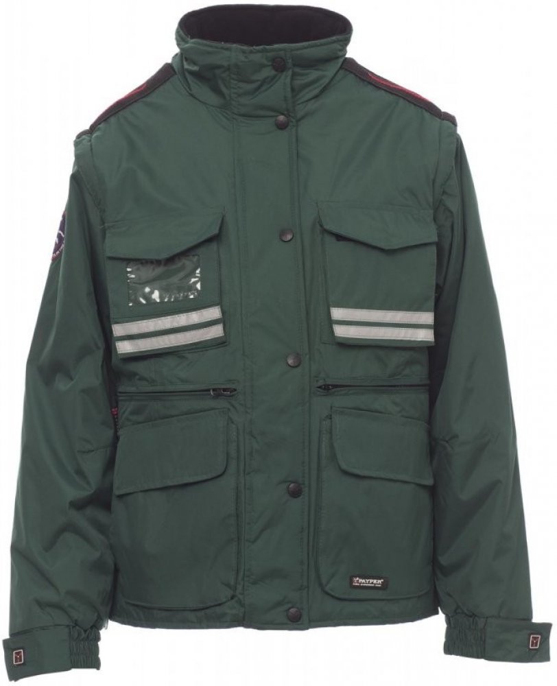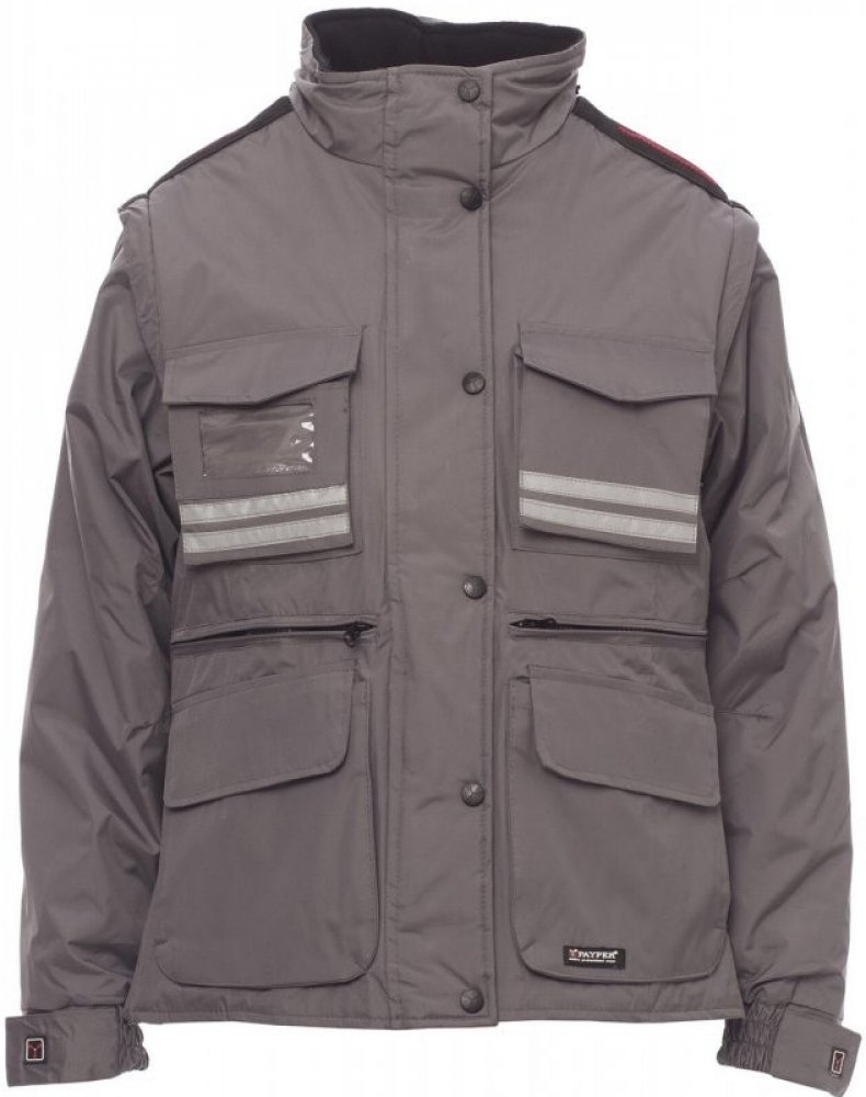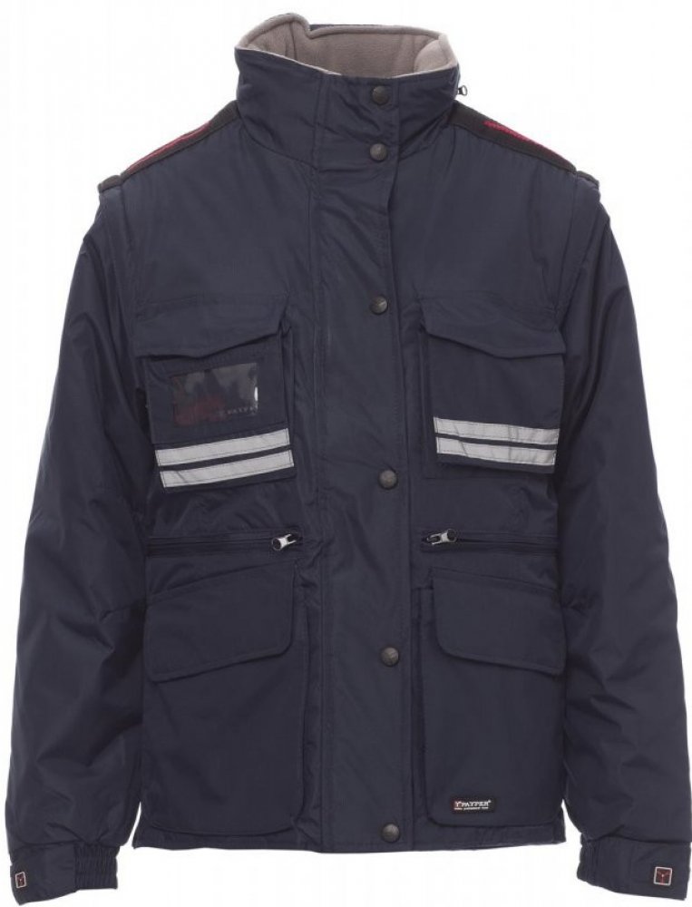 Dámská ergonomická bunda s 8mm plastovým zipem s kovovým jezdcem zakrytým klopou s plastovými knoflíky, odepínací rukávy, odepínatelná tvarovaná kapuce v límci, stahovací manžety, šedé reflexní pruhy na přední a zadní straně, předformované rukávy v oblasti loktů a boční rozparky s klínkem a zipem, devět vnějších kapes, z nichž dvě s LOCK SYSTEMem a vyztuženým vnitřkem, jedna s oboustranným pouzdrem na jmenovku. Vnitřek: zateplení, mikroflísový límec, záda a spodní část, prodyšné vsadky v podpaží, stahovací šňůrka v pase a zip na vnitřní straně pro snadnější potisk a vyšívání.