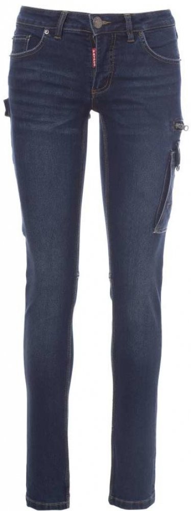 Dámské vícekapsové kalhoty džínového střihu, s pěti kapsami, zapínání na kovový zip a knoflík, poutka v pase, jedna velká postranní kapsa LOCK SYSTEM vevnitř vyztužená, 1 kapsa na zip, 1 kapsa na svinovací metr, 1 kapsa na smartphone, 1 kapsa na kladivo, 1 kapsička na tužky a cutter, ošetření stone washed, efekt obnošení a oprání, úzké nohavice, kontrastní odolné trojjehlové prošití na vnitřní str...