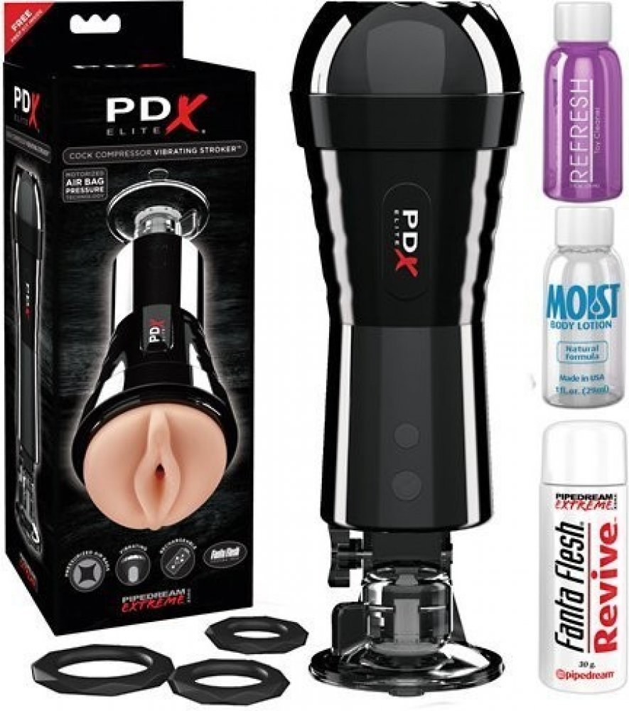 Nový precizně zpracovaný a promyšlený masturbátor PDX Elite Cock Compressor Vibr je spojení vašich představ s realitou. Pomůcka nabízí 5 režimů tlaku a 10 režimů silných vibrací. Obě funkce lze zapnout společně nebo každou zvlášť. Funkce se ovládají tlačítky na spodní části pouzdra.