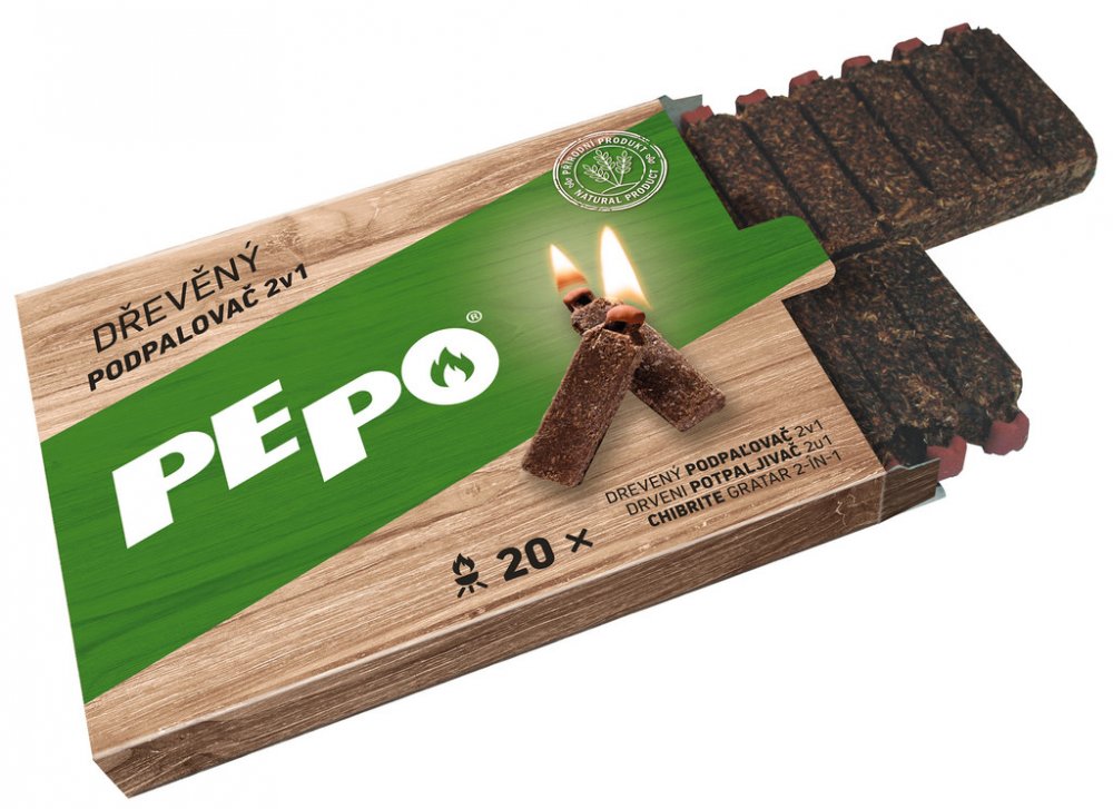 PE-PO dřevěný podpalovač 2v1, ve tvaru odlomitelných dílků, obsahuje lisované dřevěné piliny napuštěné parafínem a je na konci opatřen zápalkou.