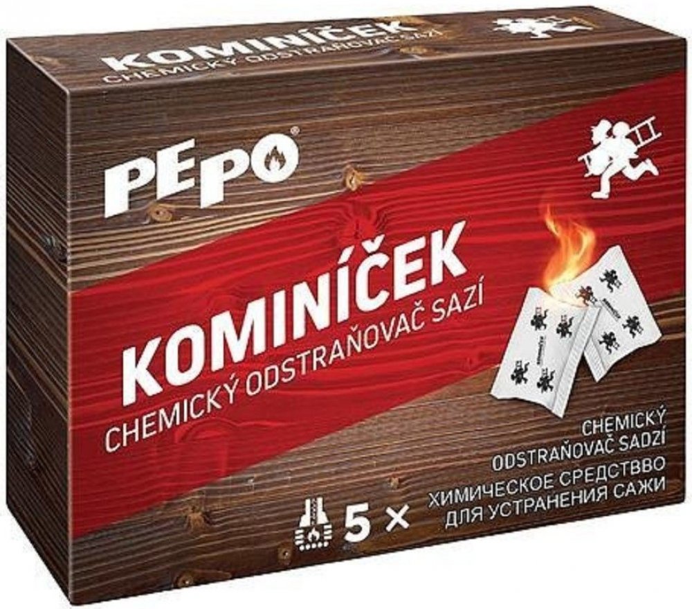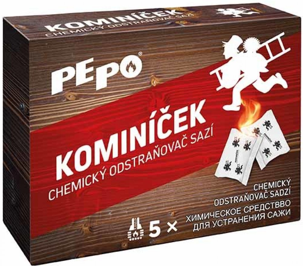 POPIS:PE-PO kominíček - přípravek k odstraňovaní sazí z komínů a kouřovodů, zlepšuje hospodárnost provozu kamen a kotlů a působí preventivně proti vzniku požárů způsobených vznícením sazí v kouřovodech. Návod na použití:Při dávkování do topidel vhoďte sáček na rozžhavené palivo a topidlo uzavřete, aby účinná látka neunikla do okolí. Snížil by se tak čisticí účinek a mohlo by dojít k uvolnění nepříjemného dýmu případně zápachu do místnosti. Používejte vždy uzavřené sáčky Kominíčka. Dávkování:- lokální topidla, krbová kamna, kotle na etážové vytápění - 1 sáček- kotle ústředního vytápění - 2 sáčkyVětší dávku najednou nedávejte. V případě potřeby (větší stupeň znečištění) aplikaci zopakujte, v topné sezóně přibližně každých 14 dní. Princip čištění:Podstatou čištění je katalytická reakce, při níž dochází k přeměně sazí na kysličník uhličitý. Jedná se o spalování bez plamene při nižší teplotě, než probíhá klasické hoření.