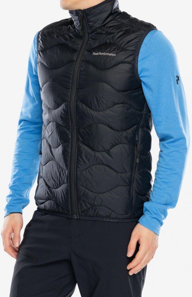 Pánská prošívaná péřová vesta z maximálně lehkého materiálu. Rovný střih, brand logo vyšité na hrudi, kvalitní výplň z kachního peří se zárukou kontrolovaného ekologického původu v poměru 90/10 s plnivostí 700 CUIN. Elastické lemy na otvorech pro ruce a v pase, prakticky řešené kapsy na zip a poutko na zádech. Materiálové složení zaručuje příjemnou hřejivost, lehkost a minimální skladnost na cestá...