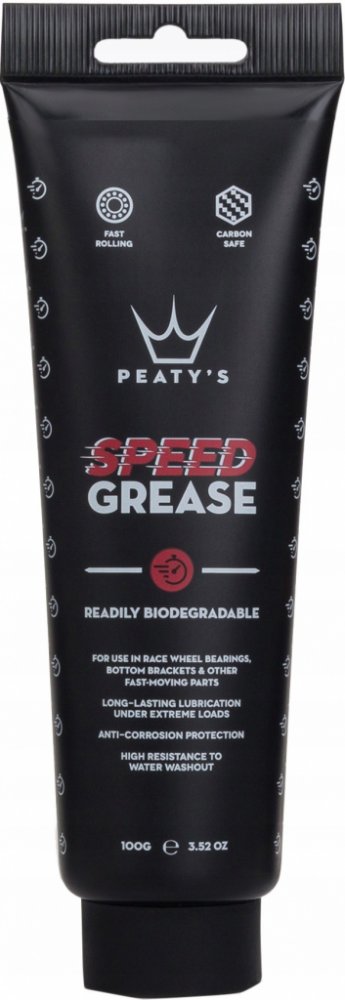 Montážní vazelína Speed Grease vykazuje 2,5 krát nižší tření než Assembly Grease, přitom si ale stále zachovává dlouhodobý výkon i při extrémních tlacích. Je dokonalou volbou pro náboje, středová složení, pedály a jiné rychle se pohybující části. Peaty’s Speed Grease splňuje vysoce náročný test 301B biologické rozložitelnosti, zároveň však vykazuje vysokou voděodolnost, vynikající antikorozní vlastnosti a přilnavost ke kovovým částem a je plně slučitelný s většinou ostatních konvenčních maziv.