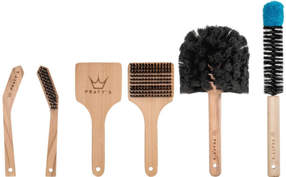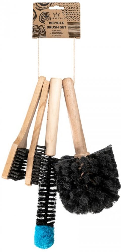 Tato efektivní sada kartáčů pro dokonalé vyčištění kola od nečistot si poradí s nejzazšími záhyby. Kartáče jsou vyrobeny ze štětin a bukového dřeva, a navíc jsou lakovány pro delší životnost. Balení obsahuje následující: 1x Peaty’s Bog Brush - Tento robustní kartáč s kulatou hlavou a měkkými odolnými štětinami v rozsahu 360° lze použit na celé kolo bez obav z poškrání. 1x Peaty’s Detail Brush - Podlouhlý kartáč se špicí z modrých bavlněných vláken a tělem z tvrdý štětin je vhodný pro těžko dostupné prostory jako např. pedály, ližiny, náboje apod. 1x Peaty’s Drivetrain Brush - Menší zahnutý kartáč, který je vhodný zejména na očištění řetězu a kazety od nežádoucích nečistot. 1x Peaty’s Tyre Brush - Čtvercový kartáč uzpůsobený pro čištění plášťů.