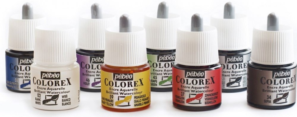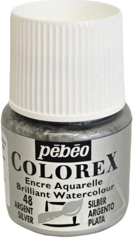 Akvarelový inkoust Pébéo Colorex 45 ml, 48 - SilverInkousty Colorex od firmy Pébéo jsou vyrobeny z pigmentů, které nabízejí nesrovnatelně vyšší zářivost a jsou tak celosvětovou referencí ve světě grafického umění. Mnoho studentů uměleckých škol, stejně jako ilustrátoři, grafici a designéři pracují s těmito inkousty, které nabízejí 60 nádherných a živých barev.Inkoust je ředitelný vodou a po zaschnutí se dá rozmýt. Je vhodný na akvarelové techniky. Můžete jej nanášet štětcem, vodním štětcem, který naplníte inkoustem, nebo aplikátorem, který je součástí lahvičky.