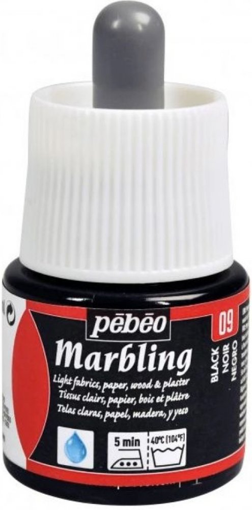 Mramorovací barvy Pébéo Marbling 45 ml, 09 BlackBarvy pro vytvoření mramorového (marbling) efektu s lesklou povrchovou úpravou.Lze jej použít při tvoření na většinu povrchů: látka, papír, karton, recyklovaný papír, dřevo, sádra atd. Barvy lze vzájemně míchat. Na textilu fixujte zažehlením.Jak na toPříprava lázněZahušťovací lázeň je nutné připravit předem. 2 čajové lžičky (7 g) zahušťovadla Marbling za silného míchání metličkou vsypeme do 1 litru studené vody a necháme 2 hodiny odstát. Poté nalijte 1 až 2 cm silnou vrstvu gelu do plastového tácku nebo misky, která je větší než předměty, které chcete ozdobit.Proces mramorováníPomocí kapátka opatrně umístěte vybrané barvy Marbling na povrch lázně. Ideálně střídejte světlé a tmavé barvy: překrývají se, ale nikdy se nemíchají.Než začnete s tyčinkou pracovat, nechte kapky několik sekund rozprostřít. Naváděním barev různými způsoby můžete dosáhnout různých vzorů a mramorových efektů: tečkované, česané efekty atd. Stačí umístit kapky barvy do sebe a získat soustředné efekty.Jakmile je mramorování hotové, opatrně položte na povrch barevné lázně zdobící látku nebo papír nastříhaný na míru. Před vyjmutím nechte 10 až 15 sekund stát. Rychle opláchněte pod tekoucí vodou, abyste odstranili přebytečný gel + směs barvy. Ozdobený předmět položte na rovný povrch a nechte zaschnout. Na textilu fixujte zažehlením.Před zahájením prací je vhodné vždy provést předběžné zkoušky na zvoleném objektu!