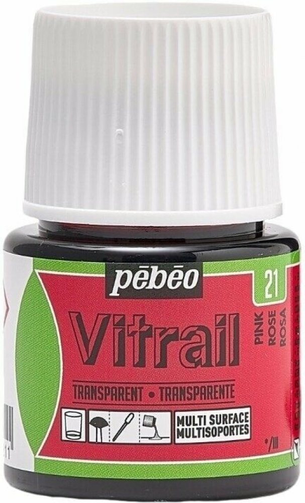 Barva na sklo. Kategorie „Umělecká řemesla“ společnosti Pébéo zahrnuje výběr výjimečných nástrojů a materiálů pro nadšené tvůrce, včetně barev Vitrail. Tyto produkty, navržené tak, aby spojovaly výkon a kreativitu, nabízejí přesnost a profesionální kvalitu, ideální pro projekty v oblasti dekorace, restaurování nebo uměleckého přizpůsobení. Společnost Pébéo podporuje řemeslníky a umělce v objevování jedinečných technik prostřednictvím inovativních a dostupných produktových řad. Barvy na sklo Vitrail od společnosti Pébéo lze nanášet štětcem na většinu pečlivě odmaštěných průhledných povrchů: sklo, acetát, polyester, plexisklo, kov. Barva na bázi rozpouštědla má po zaschnutí průhledný lesklý povrch, ideální na vitrážové efekty Po zaschnutí lze barvu jemně omýt bez smáčení, je odolná vůči prostředkům na čištění skla. Předměty zdobené barvami Vitrail nejsou určeny pro praktické použití, slouží pouze k dekorativním účelům.