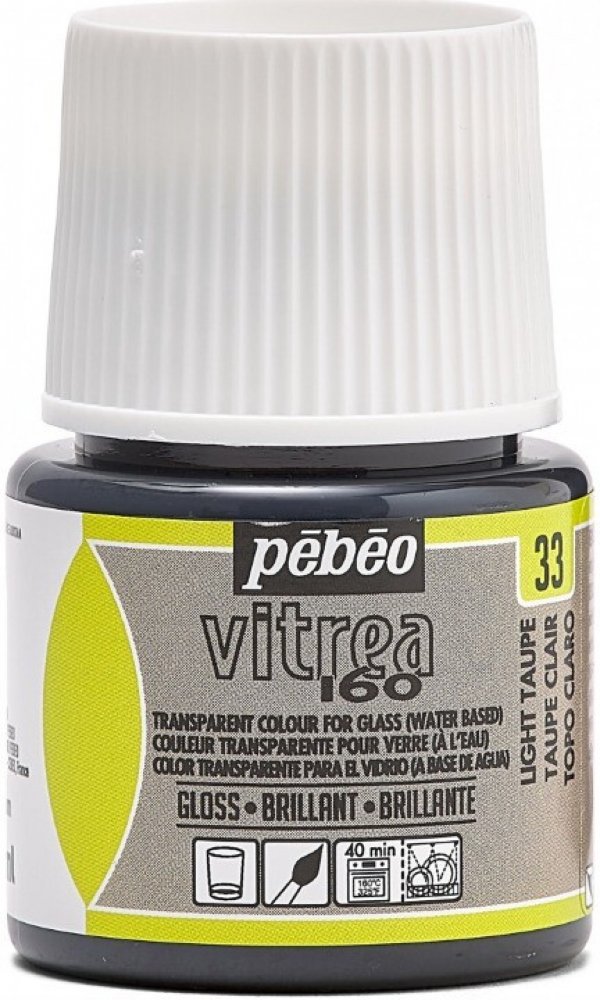 Barva na sklo. Na vodní bázi, transparentní s vynikající odolností vůči světlu a lesklým povrchům. Před nanesením Vitrea 160 stačí povrch jednoduše odmastit alkoholem nebo mýdlovou vodou. Dekorovaný předmět vložte do studené trouby. Jakmile teplota dosáhne 160 °C, pečte 40 minut. Po uplynutí doby pečení otevřete troubu a nechte předmět vychladnout uvnitř, aby nedošlo k teplotnímu šoku. Po upečení jsou dekorace vhodné do myčky nádobí (dle doporučení) a odolné vůči rozpouštědlům a běžným čistícím prostředkům. Dekorovat by se měly pouze povrchy, které nejsou určeny ke kontaktu s potravinami. Pokud aplikace končí přibližně 1 cm od okraje, je bezpečné pít ze skla zdobeného Vitrea 160.