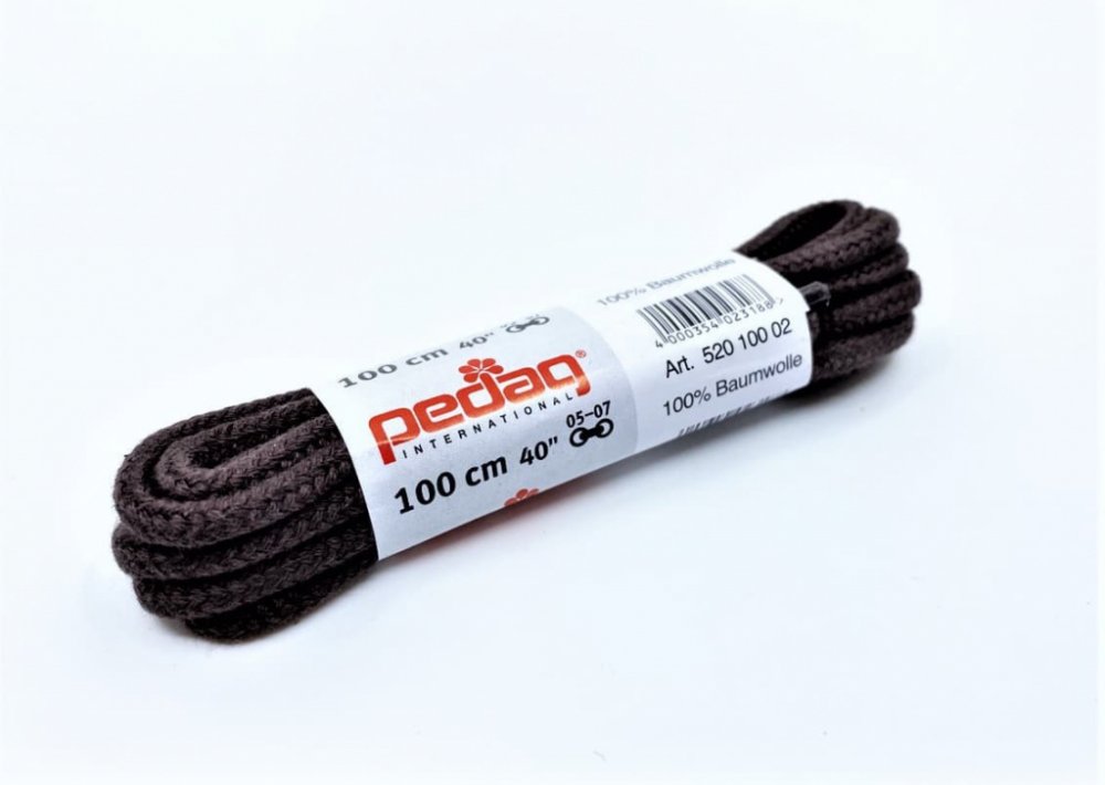Kvalitní kulaté tmavě hnědé tkaničky do bot od německého výrobce Pedag. Kulaté tkaničky jsou jsou odolnější a pevnější a tak se dají více utáhnout, než tkaničky ploché. Jsou vhodné i do pevnějších trekových bot. Nicméně mají větší tendenci se samovolně povolovat.