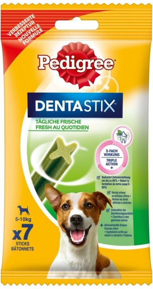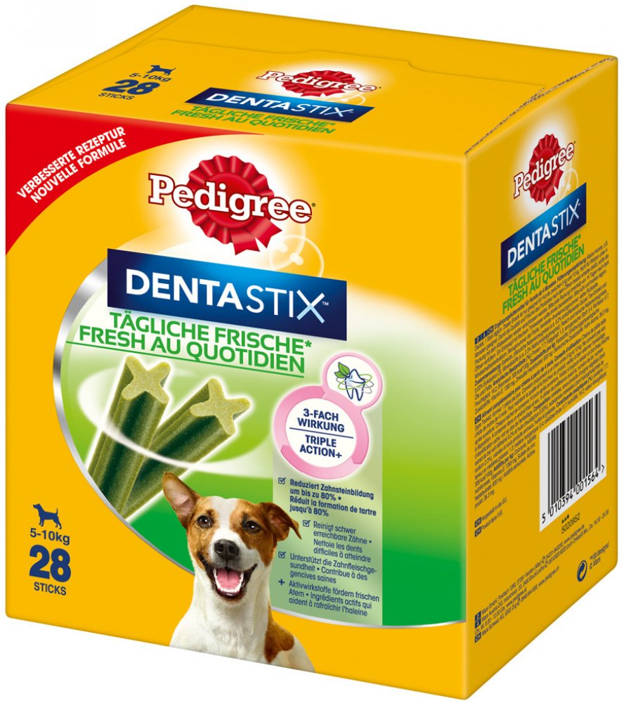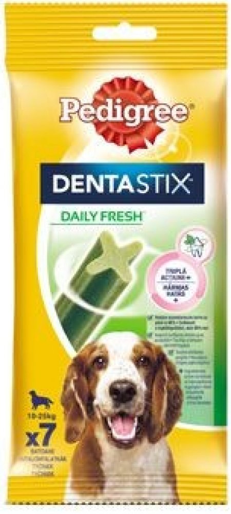 Pedigree Denta Stix Fresh je doplňková strava - dentální péče pro dospělé psy od 5 do 10 kg a pro štěňata starší 4 měsíců. Pedigree Denta Stix je chutná žvýkací kostička pro každodenní péči o chrup. Jedinečný tvar a složení Pedigree Denta Stix dokáže odstranit až 80 % zubního plaku, a působí tak preventivně proti nemocím dásní a udržuje svěží dech psa. Řada Fresh se od běžného Denta Stix liší příd...