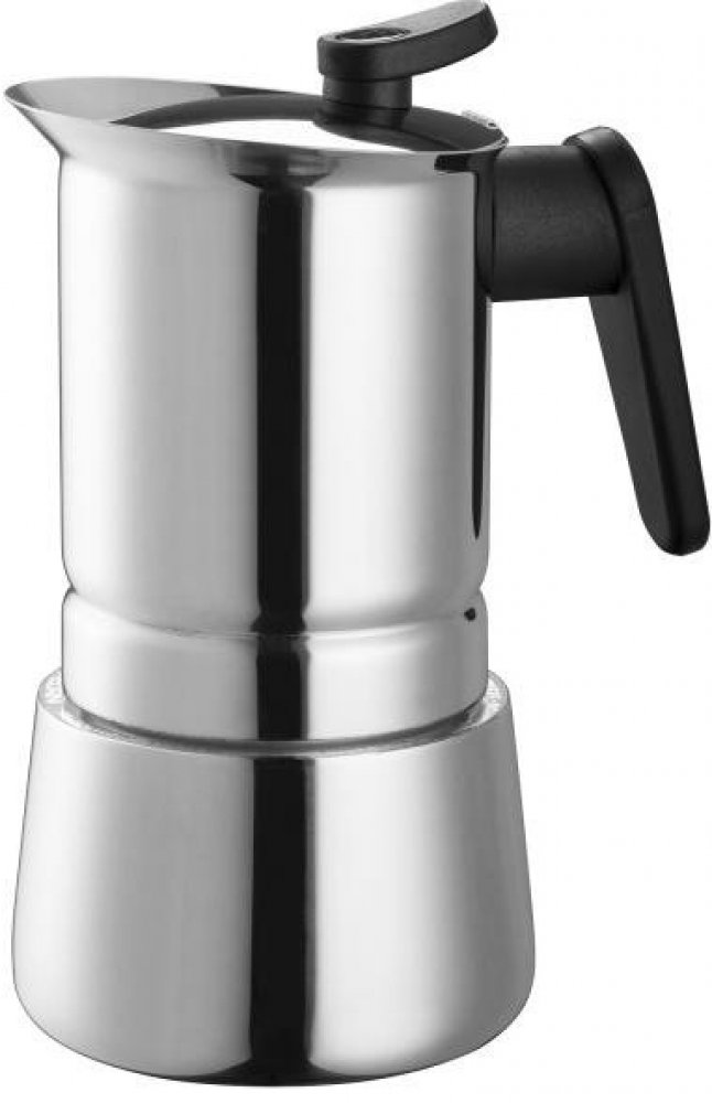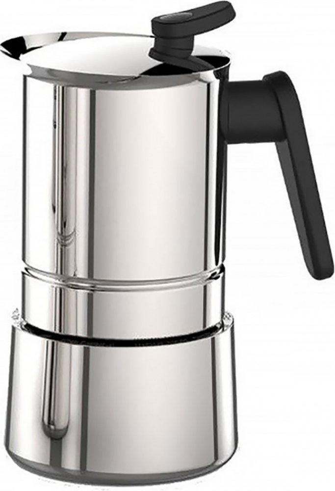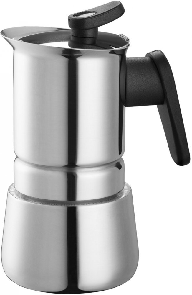 Induční moka konvička vyrobená z nerezové oceli 18/10 je provedena v elegantním cylindrickém tvaru se zvýšeným okrajem na pohodlné nalévání kávy.