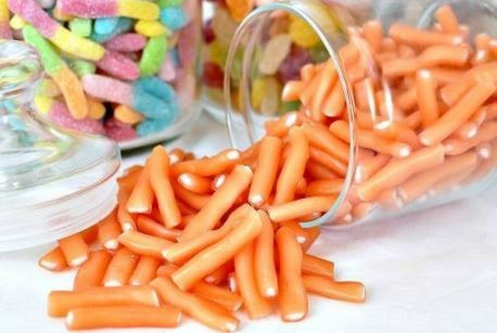 Složení: cukr, PŠENIČNÁ MOUKA, glukózový sirup, koncentrát šťávy z hroznového vína 3,7%*, rostlinné oleje (bambucký olej a kokosový olej),leštící směs kokosový olej a leštící látka šelak, regulátory kyselosti (kyselina citronová, citronany sodné), zvlhčující látka (glycerol), aroma, želatina, emulgátor (mono- a diglyceridy mastných kyselin), barviva: BCJC, 3,7% ovocného koncentrátu = 15% ovocné šťávy), koncentrát šťávy z černé mrkve.