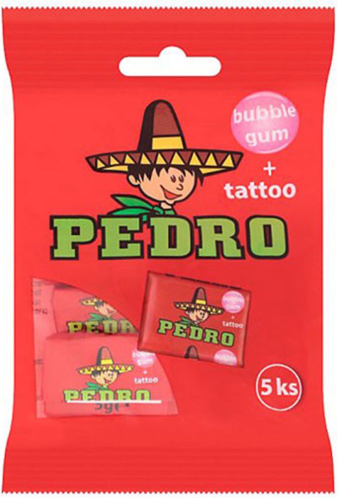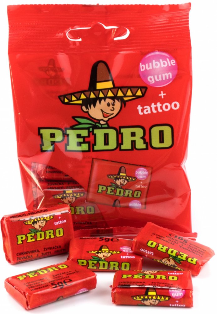 Pedro žvýkačky v tradiční růžové barvě, s ovocnou příchutí vás vrátí do sladkých dob dětství. A co na ni máme všichni nejradši? No přece zábavné velké bubliny a typické tetování. Žvýkačky se vyrábějí podle osvědčené receptury. Na výběr jsou samostatně balené Pedro žvýkačky nebo sáček s 5 ks Pedro žvýkaček. Můžete se o ně podělit, případně si je vychutnáte jednoduše sami.