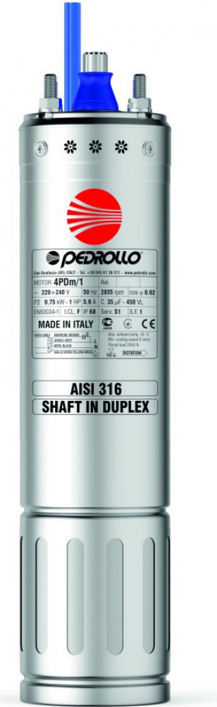 Jednofázové ponorné indukční dvoupólové motory Pedrollo 4PDm jsou určené pro pohon vícestupňových 4“ odstředivých čerpadel řady 4SR a 4HR. Jsou plněny čirým netoxickým rostlinným olejem a jsou těsněné mechanickou ucpávkou nejvyšší kvality. Certifikovaný kabel je připojen k motoru voděodolným konektorem zaručujícím jeho jednoduchou výměnu. Připojovací rozměry motorů jsou v souladu s normou NEMA.UPOZORNĚNÍ! Součástí balení jednofázového elektromotoru je rozběhový kondenzátor.Provozní limity motoruMaximální teplota čerpaného média: 35°CMaximální hloubka ponoru: 100 m (s ohledem na délku kabelu)Maximální počet sepnutí do hodiny: 20 v pravidelných intervalechMinimální proudění vody pro chlazení: 8 cm/sMotory jsou určené pro nepřetržitý provoz S1.Parametry motoruJmenovité napětí (V): 230Jmenovitý výkon (kW): 0,75Jmenovitý proud (A): 5,9 AIzolační třída: FStupeň krytí: IP 68Otáčky motoru (ot./min.): 2 825Průměr motoru (mm): 94Celková délka motoru (mm): 3974Délka kabelu (m): 1,7Výrobce: Pedrollo S.p.A.Materiálové provedeníVnější plášť: nerezová ocel AISI 316Hřídel: nerezová ocel „DUPLEX“