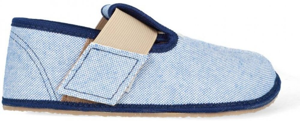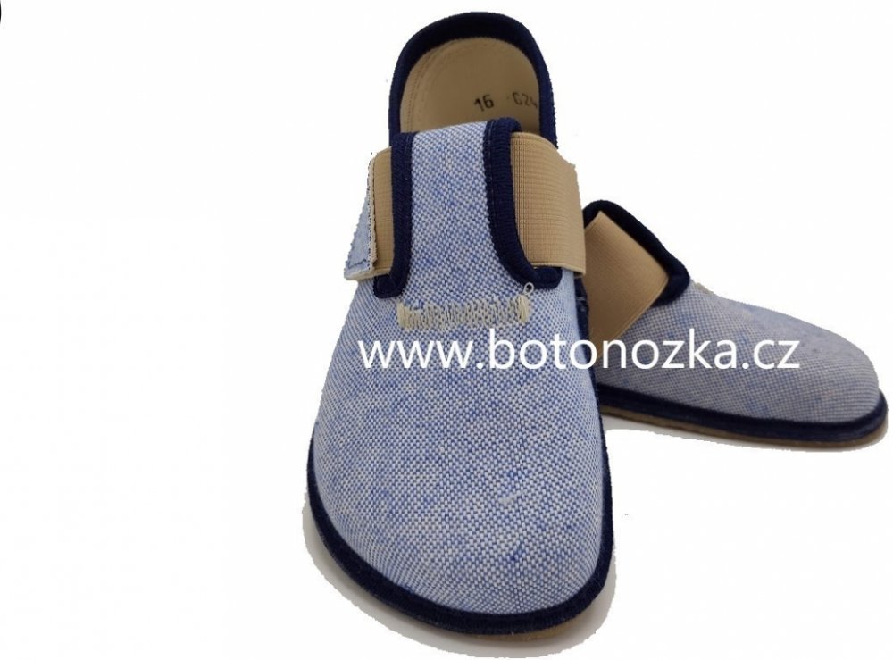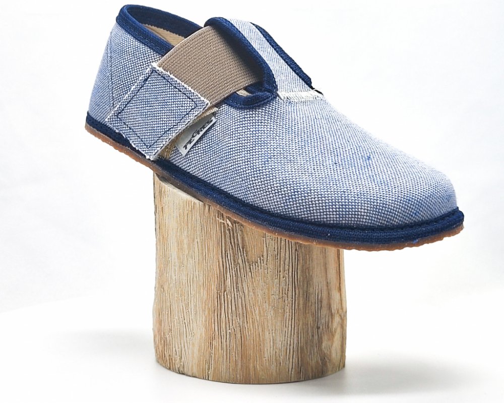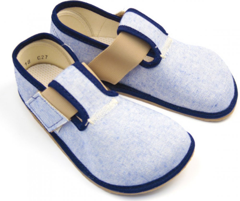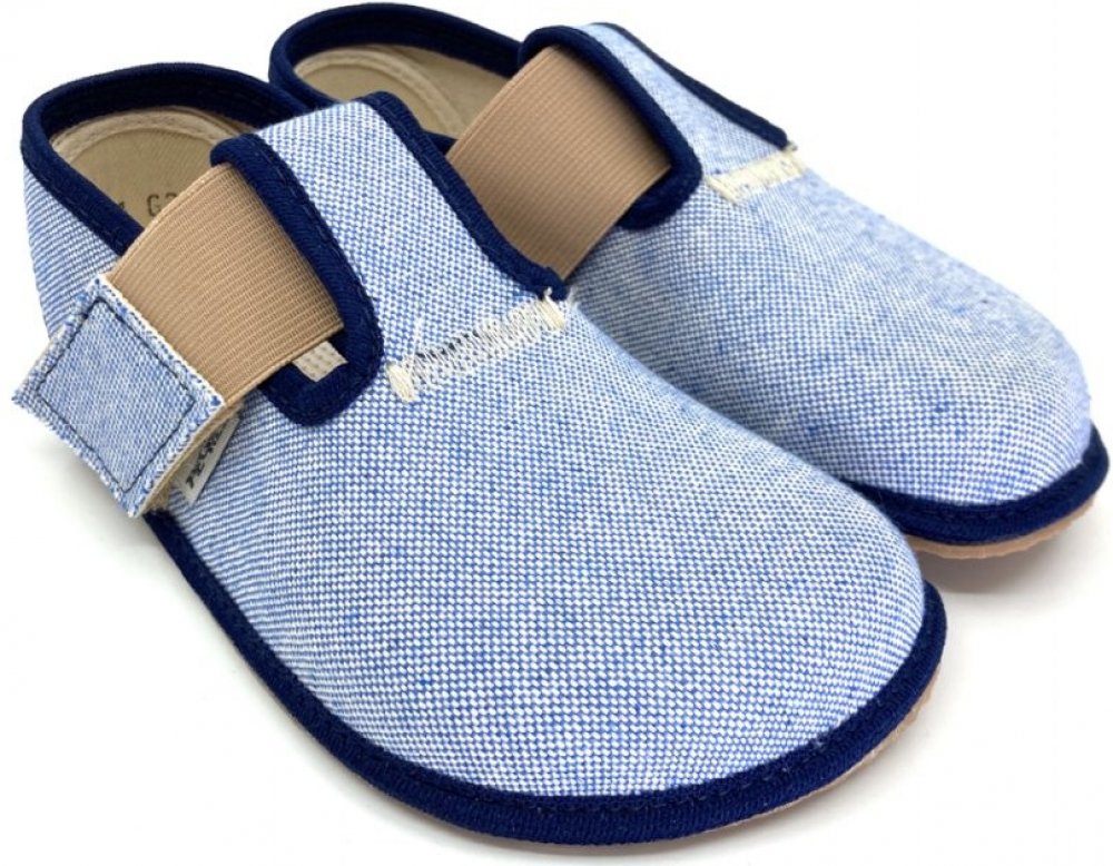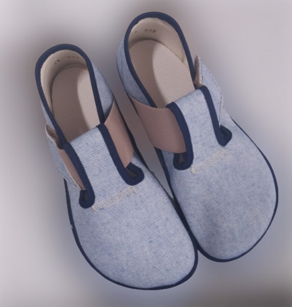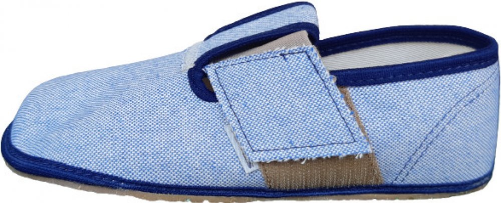 Ručně vyráběné barefoot textilní bačkůrky, modré. Jsou lehké, měkké, snadno ohebné. Špička je pěkně široká a tvarově vhodná pro dominantní palce. Bačkory Pegres BF01 jsou vhodné pro normálně široké i široké nohy s normálním i nízkým nártem. Gumová podrážka je 3mm tenká, vnitřní stélka je vyndávací.
