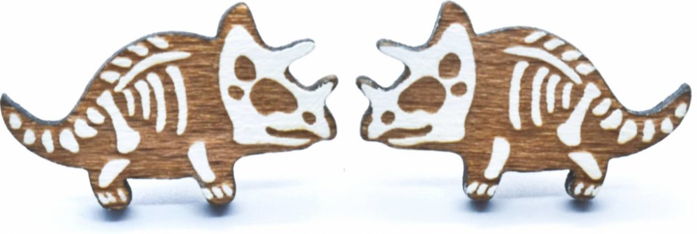 Chcete mít originální náušnice? Milujete dřevo? Pořiďte si naše dřevěné náušnice dinosaur triceratops kostra v originální grafice.