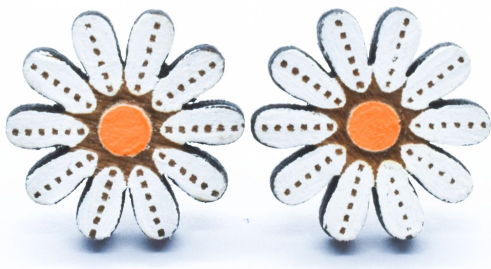 Dřevěné náušnice kytičky sedmikrásky jsou částečně upraveny akrylovou barvou.