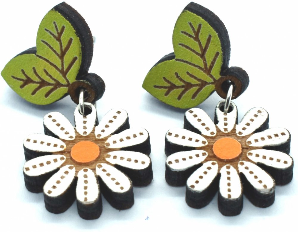Dřevěné náušnice kytičky sedmikrásky s lístekm jsou částečně upraveny akrylovou barvou.