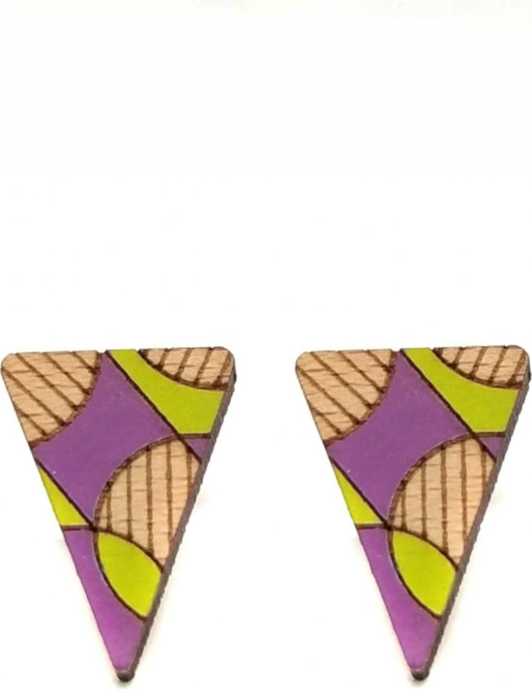 Dřevěné náušnice trojúhelníky fialovo, zelené jsou částečně upraveny akrylovou barvou.