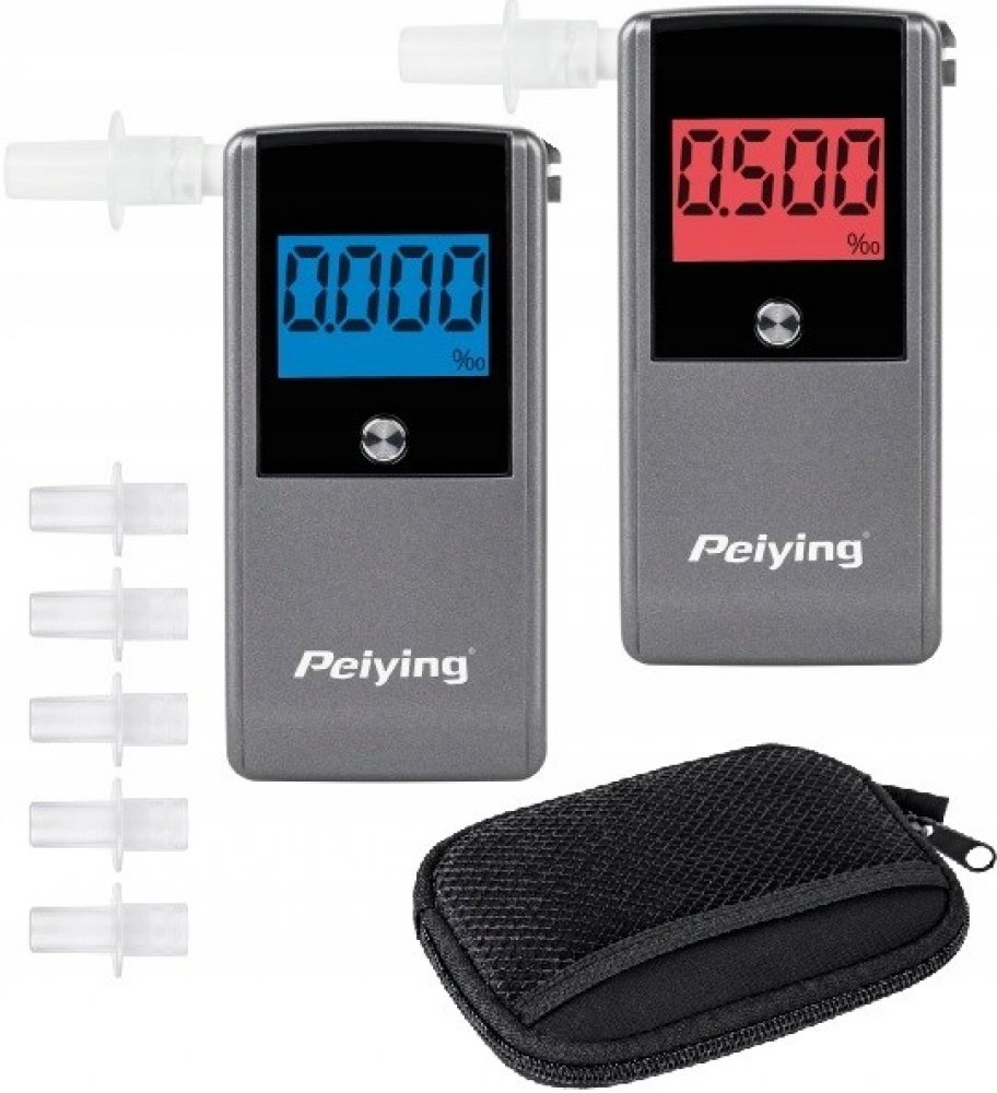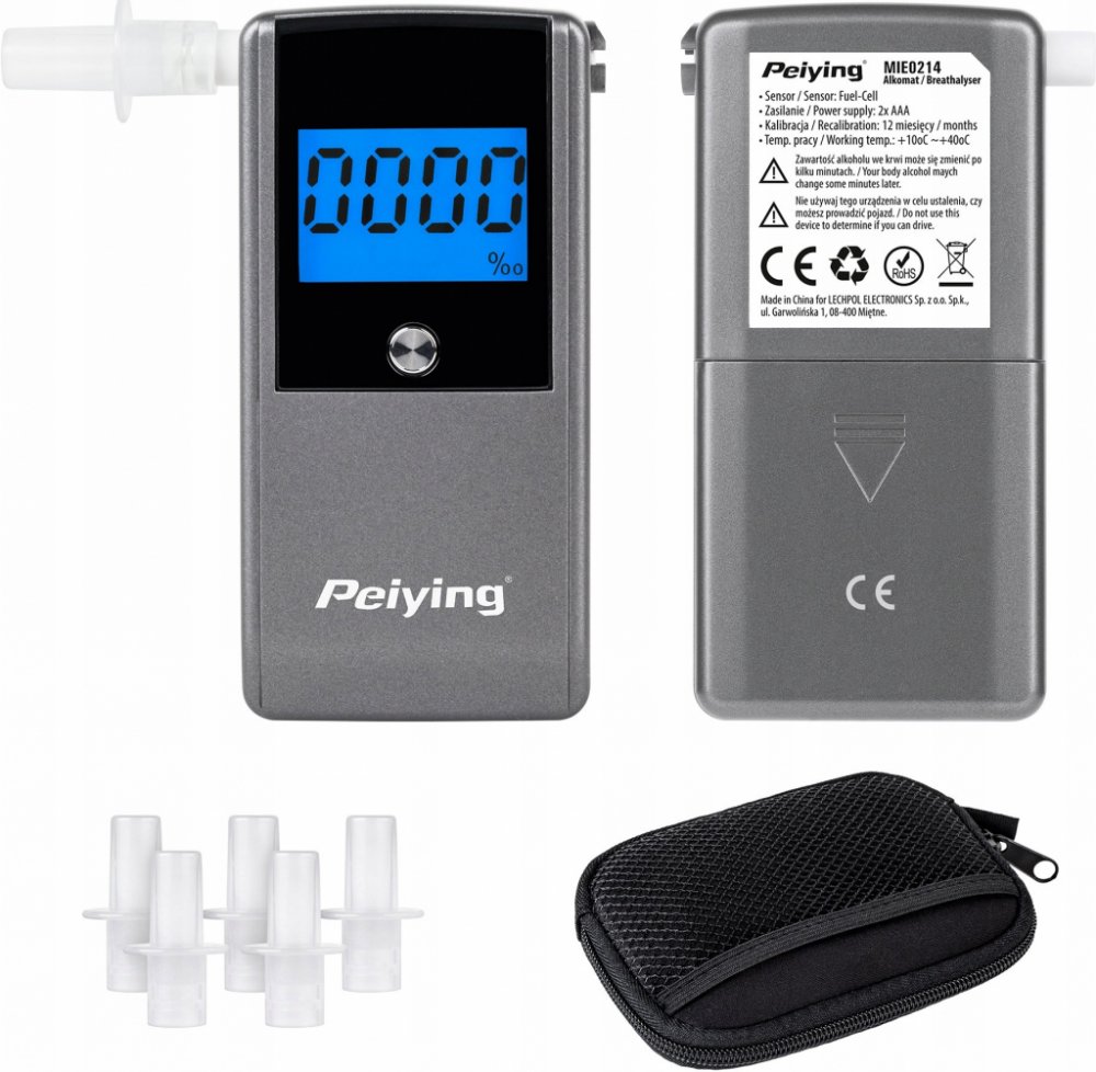 SpecifikaceElektrochemický senzor Doba výdechu při měření: 6 sekund Průtok vzduchu: 1,5 m: 10 l/min Snímač přerušení proudění vzduchu (výdech) Počítadlo měření 4místný displej s podsvícením Rozsah zobrazení: 0,00-0,20 % obsahu alkoholu v krvi Indikátor "HI" při překročení rozsahu měření Přesnost: ±0,005 % při 0,05 % 5 náustků v balení Doba zapnutí: 10-15 sekund Doba měření: 10 sekund Opakování testu: méně než 60 sekund. Pípnutí a změna barvy displeje při překročení alarmového bodu Napájení: 2 alkalické baterie AAA 1,5 V Životnost baterií: přibližně 300 měření Indikátor slabých baterií a funkce automatického vypnutí Rozsah pracovních teplot: 10°C-40°C nebo 50°F-104°F Rozsah skladovacích teplot: 0°C-50°C nebo 32°F-122°F Rekalibrace: každých 12 měsíců nebo 200 měření Rozměry: 115 x 60 x 23 mm Peiying KT-571 s elektrochemickým senzorem nové generace je velmi užitečné zařízení pro případy, kdy stojíte před těžkým rozhodnutím - jet, nebo ještě nejet. Dechový analyzátor má řadu funkcí, včetně snímače přerušení přívodu vzduchu a také zvukového signálu potvrzujícího nepřetržitý výdech, které zaručují spolehlivé a přesné měření s přesností 0,005 %. Další výhodou přístroje je možnost změny měrných jednotek na %, ‰ nebo mg/l a funkce ukládání posledních pěti měření. Dechový analyzátor má také počítadlo celkového počtu provedených měření, které je užitečné pro výpočet doby pro rekalibraci (po 12 měsících nebo po 200 měřeních).Přístroj je napájen dvěma alkalickými bateriemi AAA 1,5 V, takže na jednu sadu baterií můžete provést až 300 měření. Díky funkci automatického vypnutí a indikátoru slabých baterií máte jistotu, že vás přístroj nezklame ani v krizové situaci.Velký displej LCD s modrým podsvícením poskytuje komfort například při čtení měření v noci. Při překročení limitu vás analyzátor dechu upozorní zvukovým signálem a displej změní barvu. Součástí sady je pět náustků. Celé balení je uloženo v elegantním černém pouzdře odolném proti poškození.