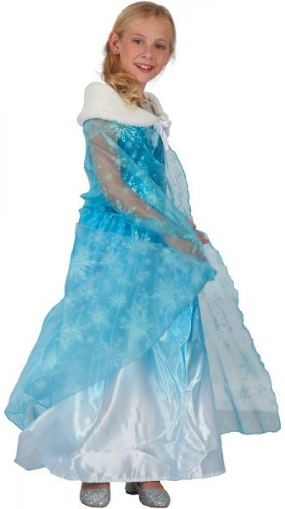 Je ušitý z polyesterového materiálu a zdobený třpytivými hvězdami. Zdobí ji také vysoký límec z bílé umělé kožešiny se zavazováním pod krkem.
