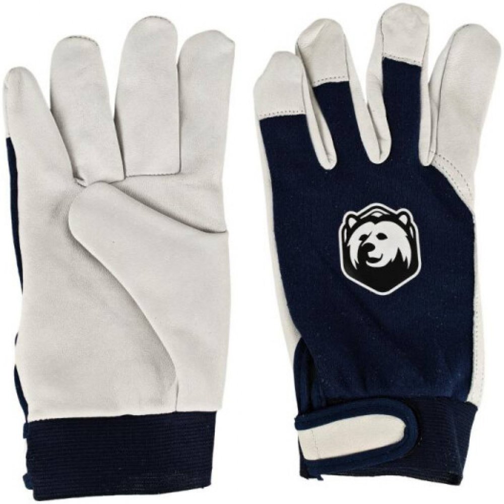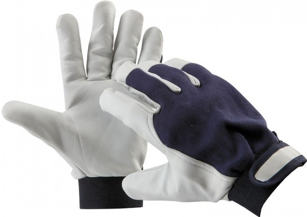 - Dlaň z jemné lícové kůže, hřbet z modré bavlněné tkaniny, manžeta na suchý zip na zápěstí