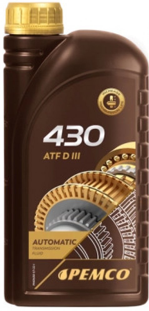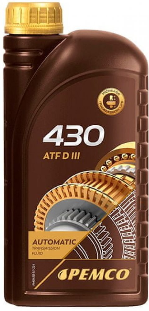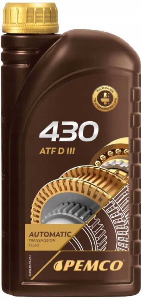 Celoroční převodová kapalina na syntetické bázi pro automatické převodovky (ATF), hydraulické měniče, hydraulické posilovače řízení, automobilové hydraulické spojky a další hydraulická zařízení, včetně těch, která pracují v těžkých podmínkách v nákladních a terénních vozidlech. Barva: červená PEMCO 430 ATF DIII zajišťuje bezchybný chod automatické převodovky, zaručuje minimální opotřebení, dlouhou životnost převodovek a úsporu paliva. Byl vyvinut na základě požadavků stanovených skupinami GM a Ford. Doporučuje se pro automatické převodovky osobních a užitkových vozidel vyžadující kvalitní olej ATF typu Dexron-III H/G/F nebo Dexron-II E nebo FORD MERCON V. Je určen pro většinu automatických převodovek pro General Motors, Ford Company a další značky vyrobené do roku 2006.