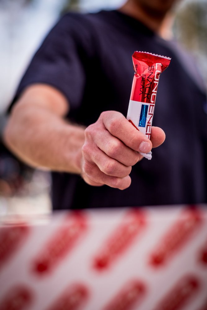 SLOŽENÍ: sójová krupice 25%, cukr, glukózový sirup, rostlinné oleje (Shea olej, kokosový olej), isomaltulóza* (Palatinose TM) 10%, fondán (cukr, pitná voda, glukóza), sušené mléko odtučněné, sušená syrovátka, směs větvených aminokyselin BCAA 1,6% (L-leucin 0,8%, L-valin 0,4%, L-isoleucin 0,4%), rumové aroma, emulgátor: sójový lecitin, kokosové aroma. *Isomaltulóza je zdrojem glukózy a fruktózy.