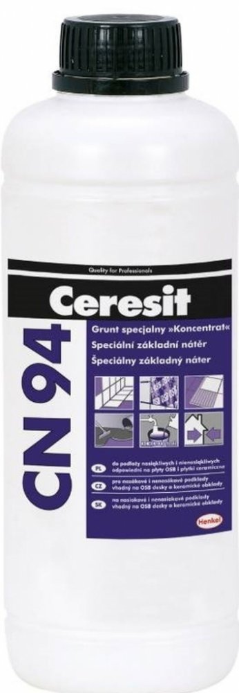 Ceresit CN 94 CONCENTRATE je speciální penetrační nátěr pro ošetření savých i nesavých podkladů před lepením obkladových materiálů, nanesením povrchových vrstev a vyrovnávacích hmot. Používá se pro penetraci podkladů v interiéru i exteriéru před aplikací vyrovnávacích hmot, lepidel a utěsňovacích stěrek proti vlhkosti. Může byt nanášen na plochy podlah i stěn, na podklady savé i nesavé. Nátěr zpevňuje povrch podkladu, omezuje jeho savost a zvyšuje přídržnost dalších vrstev. Je možno jej aplikovat na podklady, jako jsou anhydrit, cementové potěry, podlahové a montážní desky, dřevotřísky a OSB desky, vyrovnávací hmoty, stávající obklady a dlažba, tradiční omítky, pórobeton, sádrové podklady, cementové potěry včetně potěrů s podlahovým vytápěním. V interiéru také pro penetraci kritických podkladů, jako jsou potěry s těžko odstranitelnými zbytky lepidel, glazované keramické obklady a dlažbu, disperzní a epoxidové nátěry. Vlastnosti: pro OSB desky a stávající obklady na kritické podklady zpevňuje povrch podkladu zajišťuje vysokou přídržnost pro podklady savé i nesavé umožňuje ředění s vodou v poměru 1 : 3 pro savé podklady rychleschnoucí Technické informace: Hustota: 1,02 kg/dm³ Barva: bledě modrá Teplota pro zpracování: od +5 °C do +25 °C Poměr míchání: neředěný nebo 1 : 3 s vodou (viz. zpracování) Doba schnutí: od 2 do 4 hod. Orientační spotřeba: 0,03 do 0,12 kg/ m² dle použití Balení: 1 l a 5 l plastový kanystr
