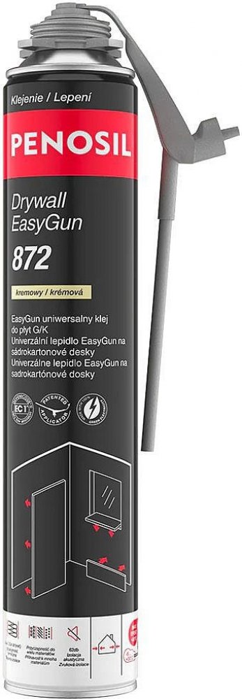 PENOSIL PU lepidlo na sádrokartonové desky 872 je profesionální jednosložkové polyuretanové lepidlo.Je určené k lepení sádrokartonu, vláknocementových, cementových a dřevěných desek (OSB) na podklady z běžného betonu, pórobetonu, keramických cihel, silikátových tvárnic a dřevěných desek.Unikátní technologie umožňuje přesnou a kontrolovanou aplikaci - dává možnost polohování a korekce nastavení desky jemným přitlačením na povrch s nerovností až 20 mm.Okamžitá počáteční přilnavost.Umožňuje přesné a snadné polohování desek.Zpracování za pouhých 30 minut.Pokrytí až 10 m² (3 standardní sádrokartonové desky).Žádný prach ani nečistoty.Vysoká přilnavost lepidla k povrchu.BARVAKrémová.BALENÍAerosolová nádobka 750 ml.POUŽITÍLepení sádrokartonových desek, vláknocementových, cementových a dřevěných (OSB) desek na podklady z běžného betonu, pórobetonu, keramických cihel, silikátových tvárnic a dřevěných desek.APLIKAČNÍ POSTUPPříprava produktu:Teplota plechovky by měla být mezi +5 °C a +25 °C.Před použitím důkladně protřepejte nádobku alespoň 20krát, aby se ingredience důkladně promíchaly.Našroubujte nádobku na aplikátor.Teplota aplikátoru nesmí být nižší než teplota nádobky.APLIKACENasaďte si ochranné rukavice.Pracovní poloha plechovky je „ventilem dolů“.Před nalepením desky na zeď umístěte na spodní stranu zdi kus GK nebo jiného materiálu jako distanční podložku.Lepidlo nanášejte na desku ve formě 2-3 cm širokého opletení, přičemž mezi opletením a okrajem desky dodržujte vzdálenost asi 5 cm.Mezi opleteními aplikovanými podél okraje desky nechte prázdný prostor, aby mohl unikat vzduch.Uprostřed lepené desky, mezi rameny rámu z pěnového opletení, by měla být křížem klikatě uvolněna pěna stejné tloušťky, aby se slepil střed desky.Průměr opletení lze upravit tak, aby vyhovoval potřebám vyrovnání povrchu stěny.V případě větších nerovností by se mělo použít dvojité opletení, nanášené vrstvu po vrstvě.Maximální nerovnost, kterou lze opravit pěnovým lepidlem, je 20 mm. Pokud je nerovnost větší než 20 mm, je nutné použít další distanční podložky, např. vyrobené ze sádrokartonu nebo jiných prvků.Ihned po nanesení lepidla položte desku na lepený povrch.Po umístění desky ke zdi ji opatrně přitlačte, abyste zajistili její polohu.Zabraňte poškození lepicí struktury silným tlakem nebo údery do desky. Po počáteční korekci upravte konečnou polohu desky dlouhou vodováhou a opatrně ji přitlačte ke zdi.Korekce by měla být provedena mezi 2 a 5 minutami po první aplikaci.Přibližně 30 minut po aplikaci můžete začít se zpracováním desky, tj. s vyplněním a zpracováním svislých a vodorovných spár mezi deskami.OMEZENÍRychlost vytvrzování, včetně doby korekce, silně závisí na převládající teplotě a vlhkosti vzduchu.Čím vyšší je teplota aplikace, tím kratší je tato doba.Čím nižší je teplota a blíže k minimální aplikační teplotě, tím delší může být doba korekce.Výrobce doporučuje pokaždé upravit polohu namontovaných desek.Lepidlo nevykazuje žádnou přilnavost k polyethylenu, polypropylenu, polyamidu, silikonu a teflonu.Lepidlo je bezpečné pro sádrokarton; nezničí je.Kvalita a technický stav použitého aplikátoru ovlivňuje parametry konečného produktu.4/5 nepoužívejte lepidlo v místnostech bez přístupu čerstvého vzduchu nebo ve špatně větraných prostorách a chraňte nádobu před zahřátím nad 50 °C.PŘÍPRAVA POVRCHUPovrch by měl být stabilní, suchý, čistý, bez prachu, nečistot a oleje.Před zahájením lepení zkontrolujte přilnavost lepidla ke stávajícím omítkám a povrchům.V případě potřeby odstraňte veškerou odpadávající omítku nebo barvu.Pokud povrch stěny není dostatečně dobrý, měl by být napenetrován.ČISTĚNÍČerstvé lepidlo odstraňte čističem polyuretanové pěny, ale buďte opatrní,