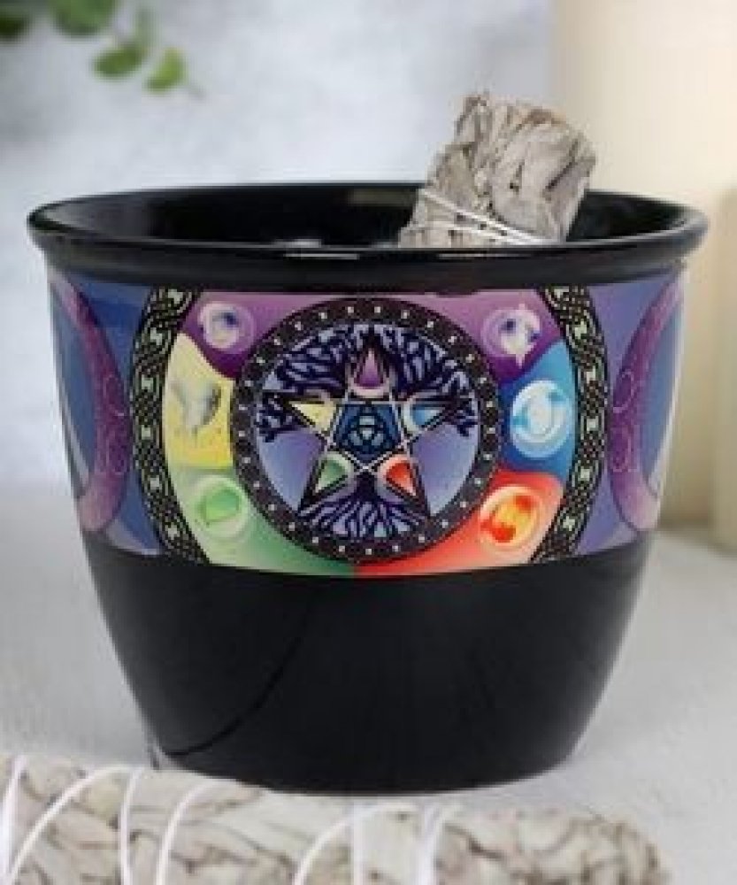 design: černá keramická miska na vykuřování s barevným symbolem pentagramu, stromu života a pěti přírodních prvků, vykuřovací miska se používá k spalování bylin nebo k držení zapálených vykuřovacích svazků a vonných dřev, spálené bylinky a žhavý popel spadnou přímo do misky