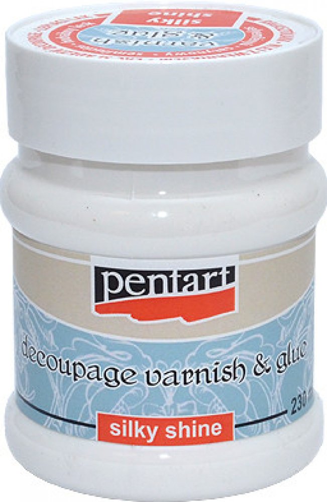 Decoupage lepidlo s lakem PENTART - lesklé Speciální lepidlo s lakem pro použití u ubrouskové techniky. Použít jej můžete pro lepení ubrousků, papíru, textilu, rýžového papíru na jakýkoli povrch, který chcete ozdobit. Objem: 230 ml Krycí schopnost: 80ml/m 2