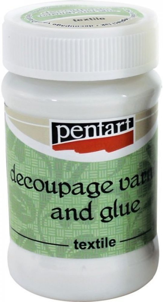 Lepidlo a lak na decoupage textilu. Lepidlo a lak v jednom s želatinovou konzistencí. Po úplném zaschnutí přežehlete celý zdobený povrch žehličkou nastavenou na žehlení bavlny. Takto upravený textil můžete prát obrácený na rub na šetrný program. Před použitím lak důkladně protřepejte!