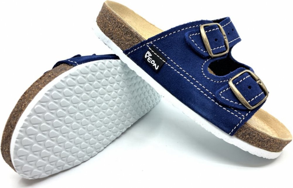 Korkové zdravotní pantofle Peon vyrobené v ČR. Pantofle mají anatomicky tvarovanou koženou stélku a podrážku, která nedělá šmouhy. Vrchní část z pravé broušené kůže v tmavě modré barvě.