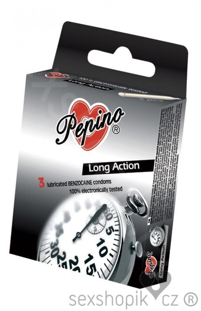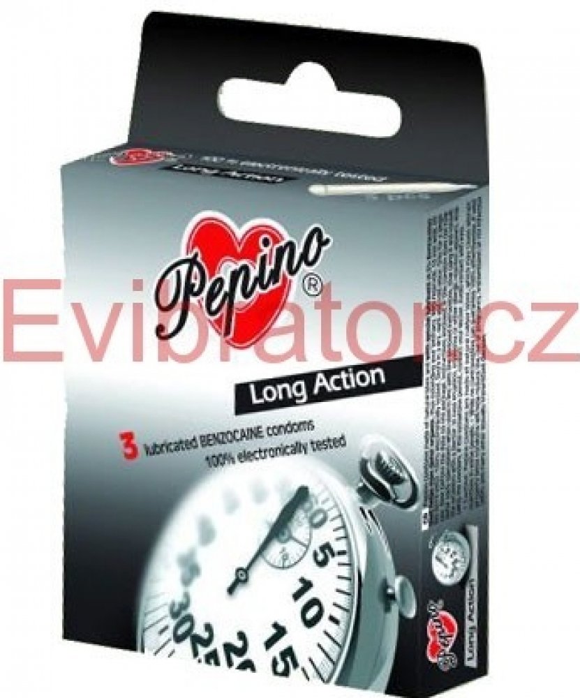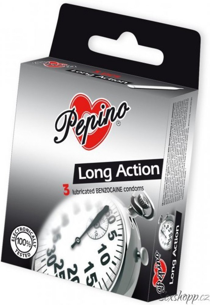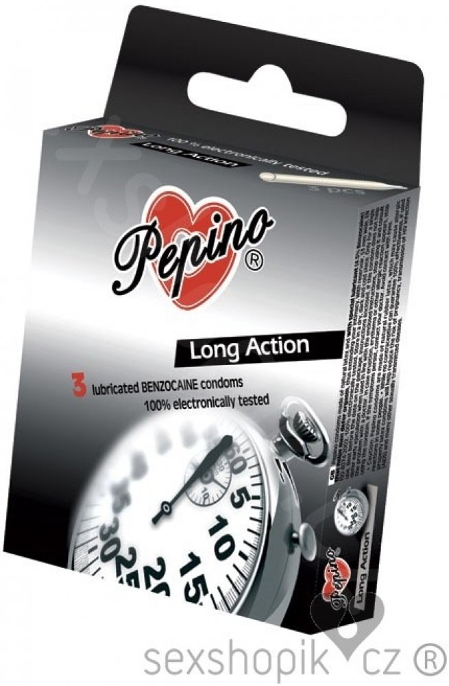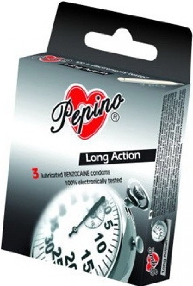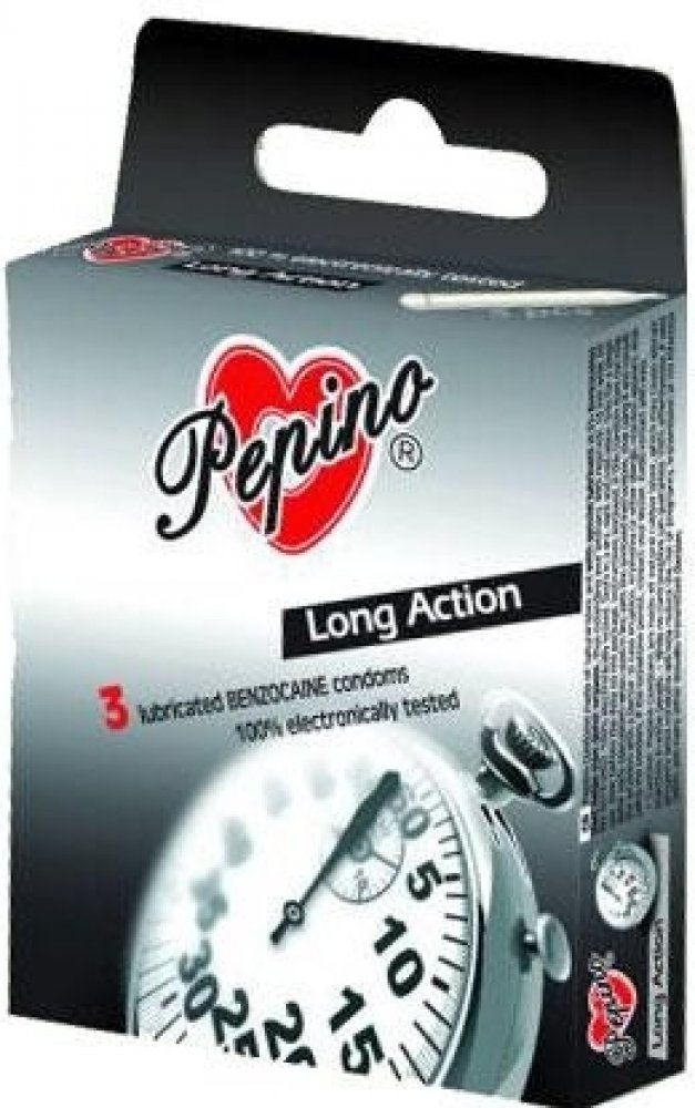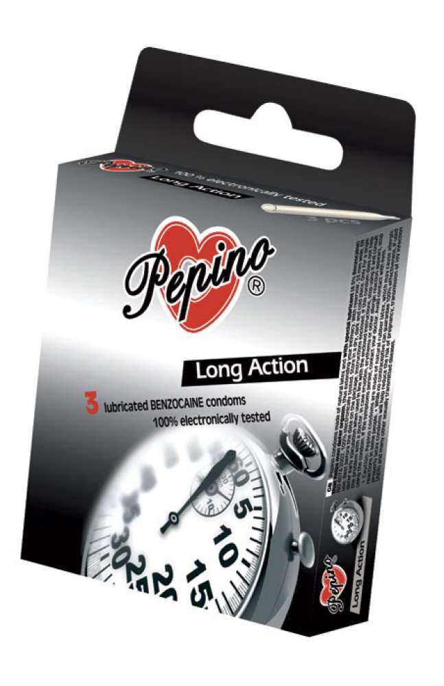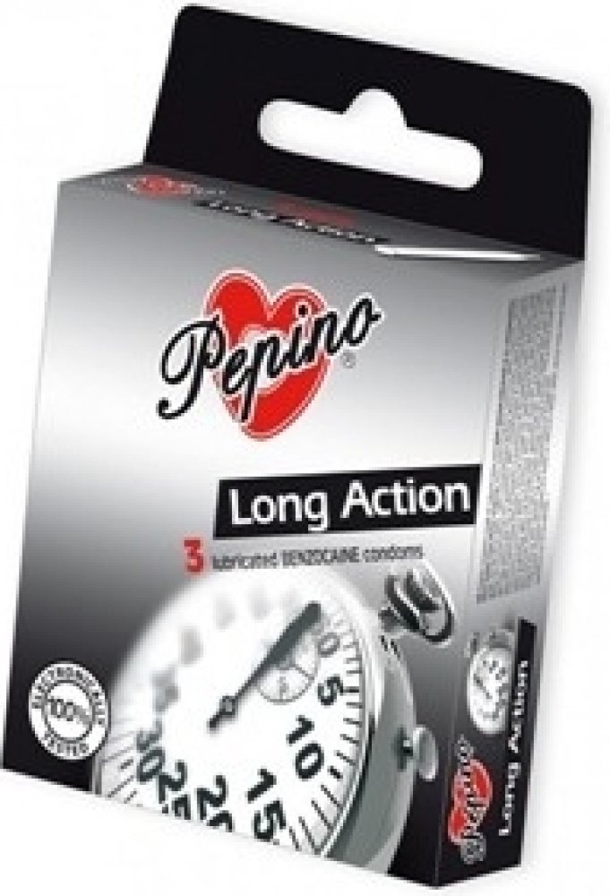 Chcete si užít delší milování. Kondomy PEPINO Long Action z přírodního latexu obsahují speciální lubrikant (s lokálním anestetikem, obvykle benzokainem), který je nanesen na vnitřní straně kondomu. Ten napomáhá u mužů oddálit vyvrcholení a tak prodlouží váš intimní styk pro potěšení obou partnerů.