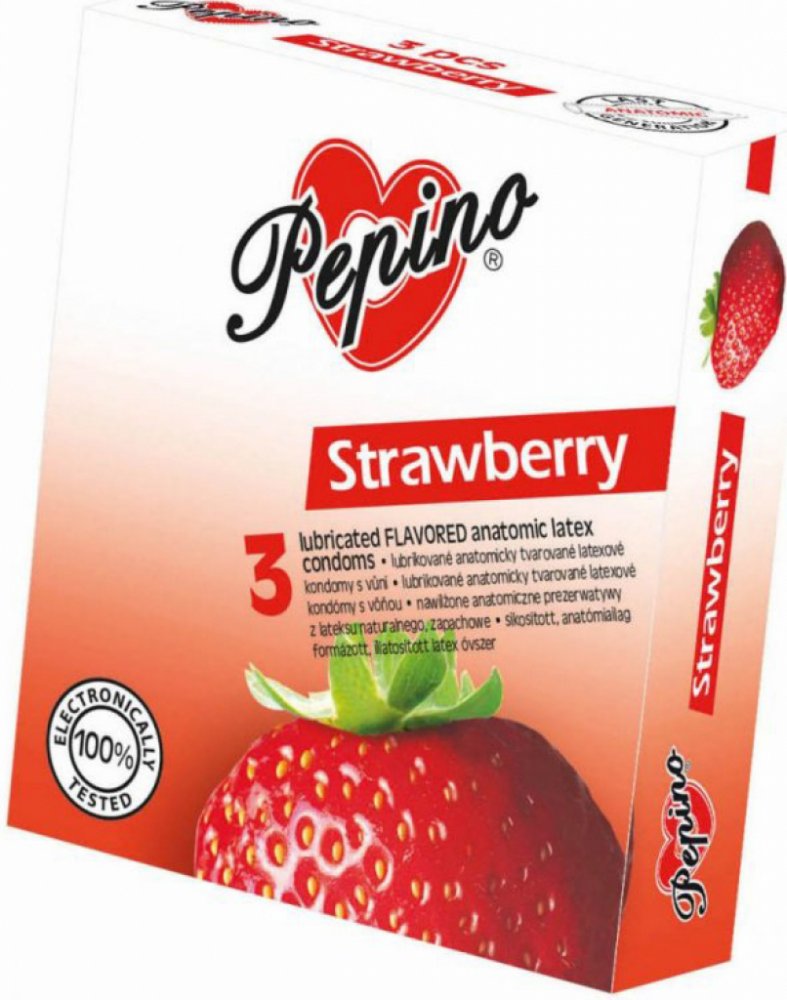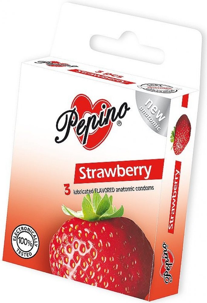 PEPINO kondomy z přírodního latexu s jahodovou vůní s rezervoárem. Šířka 53mm. Vlhčeno silikonovým olejem. 100% elektronicky testováno. Skladujte na suchém a chladném místě. Pouze pro jedno použití. 3ks v krabičce.