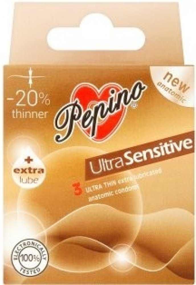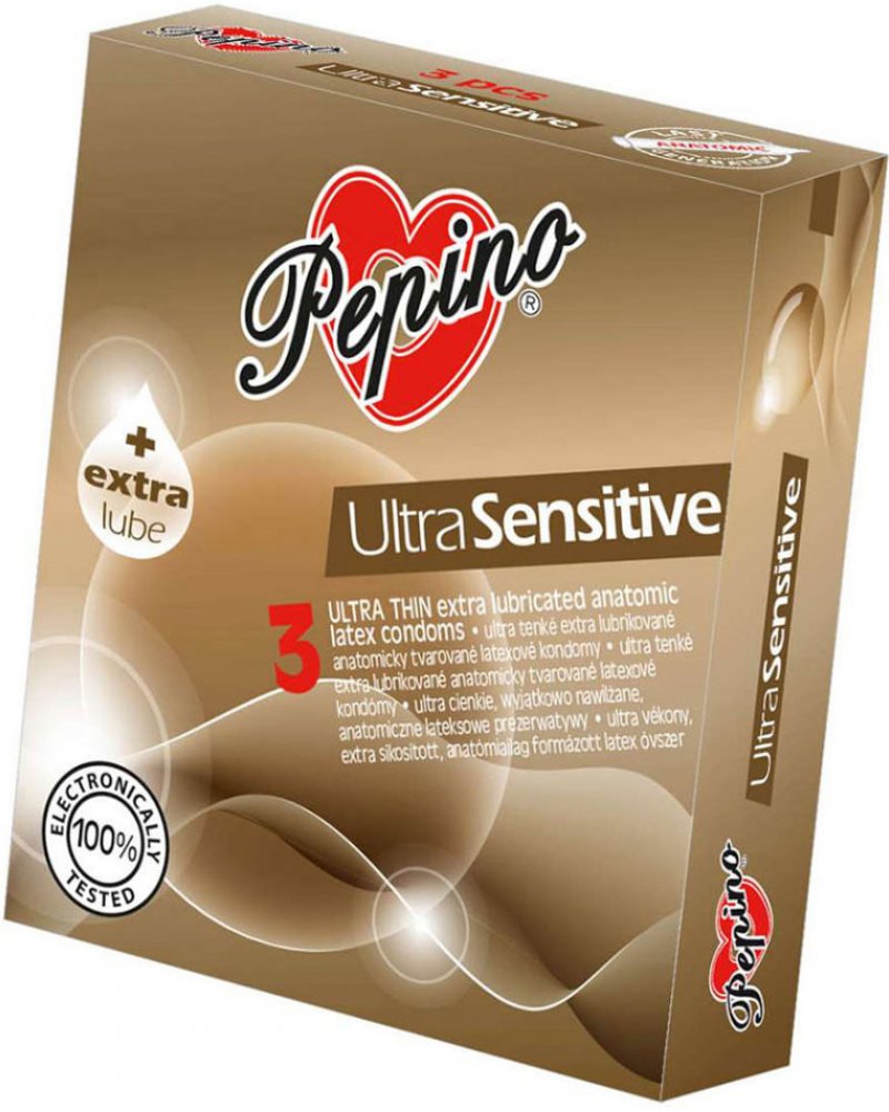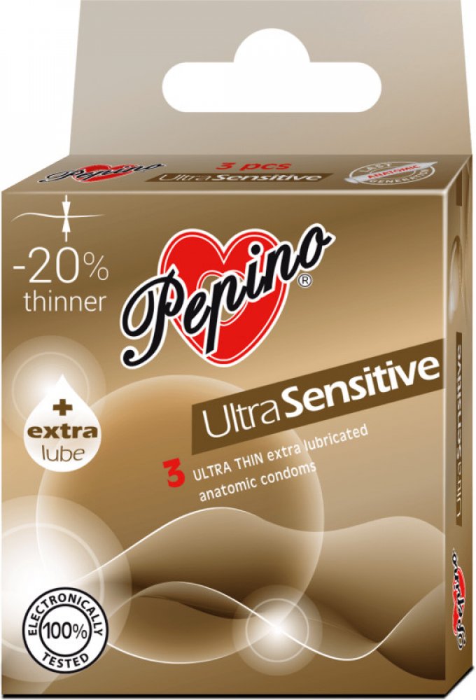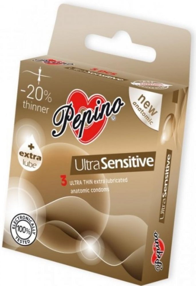 Pepino Kondom Ultra Sensitive 3 ks ultra tenký, extra lubrikovaný silikonovým olejem, anatomicky tvarovaný, z přírodního latexu, s rezervoárem. Při každém pohlavním styku. Před a po ukončeni pohlavního styku omyjte ruce a pohlavni orgány vodou. Opatrně roztrhněte folii tak, aby nedošlo k poškození kondomu.Nepoužívejte kondom, jestliže se lepí, praská nebo je jinak poškozen. Nepoužívejte jej také v případě, že je prošlá expirační doba kondomu nebo poškozený obal. Špičku kondomu (2-3 cm) přidržte palcem a ukazováčkem tak, aby se vytlačil vzduch. Pak narolujte na ztopořený penis tak, aby byl konec s rezervoárem prázdný. Buďte při tom opatrní, ať nepoškodíte kondom ostrými nehty nebo prsteny. Před ochabnutím pohlavního údu přidržte kondom při jeho kořeni a vytáhněte jej pomalu ven. Použitý kondom hygienicky znehodnotte. Nikdy jej nesplachujte do WC.Dávkování:Při každém pohlavním styku. Prezervativ je pro jednorázové použití!Prevence:Otěhotnění, pohlavně přenosných nemoci.Pro dodatečné zvlhčeni kondomu použivejte pouze lubrikanty na vodní bázi. Žádný kondom nemá 100% účinek. Je-li však správně používán, je účinný jako ochrana před otěhotněním a snižuje riziko nákazy nebo šíření pohlavních nemocí vč. viru HIV. Osobám trpícím alergiemi na latex doporučujeme používat kondom jen po konzultaci s lékařem.Složení100% latexEAN: 8592442900472