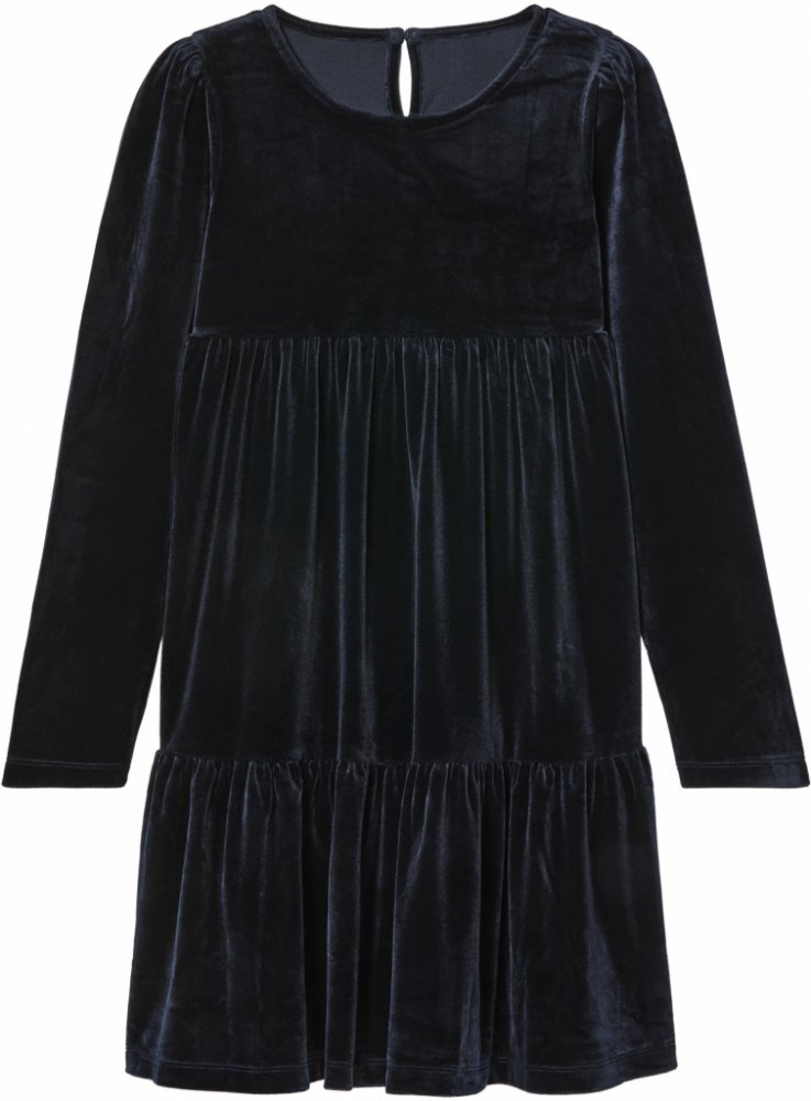 pepperts! ® Dívčí velurové šaty Příjemně měkký velur Vyrobeny z recyklovaného materiálu Kulatý výstřih se zapínáním na knoflík vzadu Nasazená sukně s módními volánky Skvěle sedí díky elastanu Lycra ® Materiál 93 % polyester recyklovaný; elastan Lycra ® Velikost 134/140 - 158/164