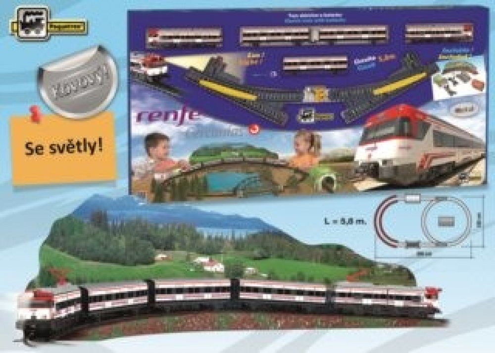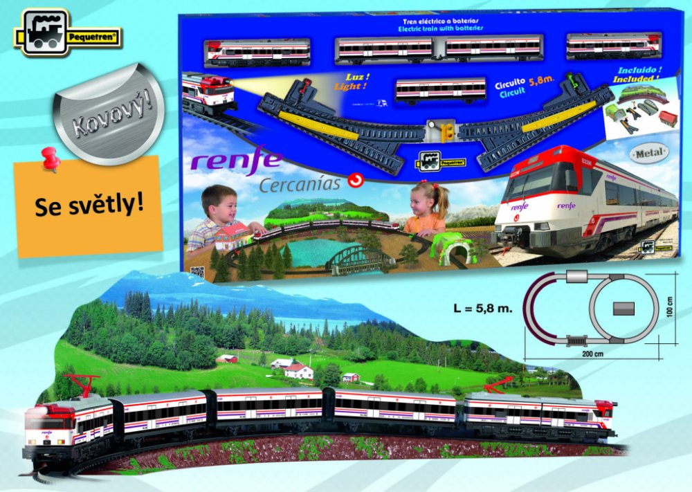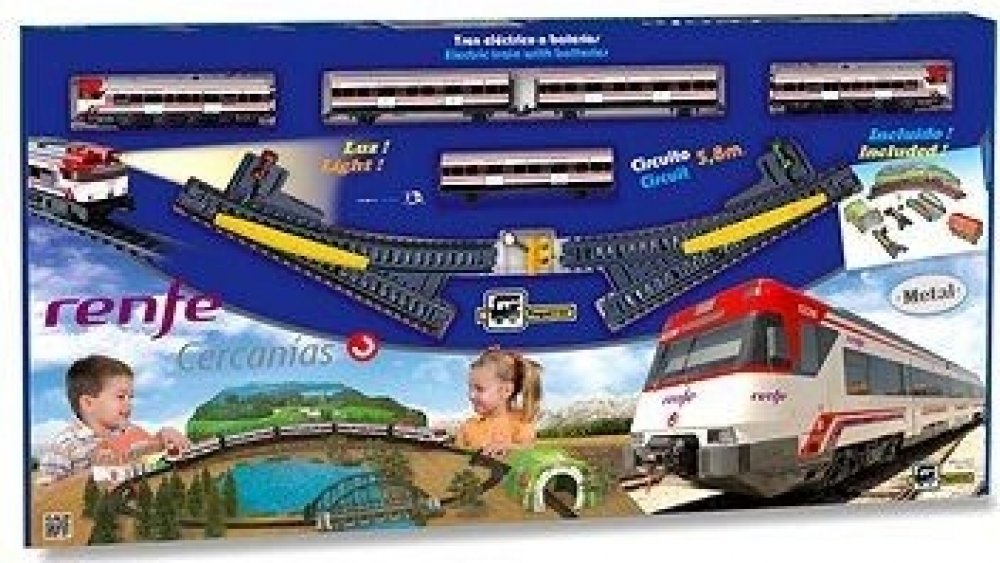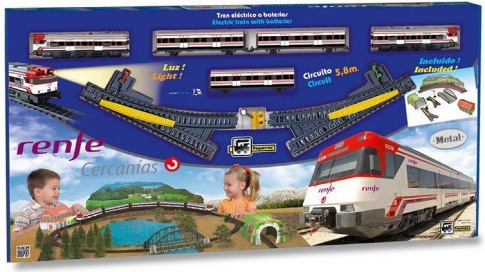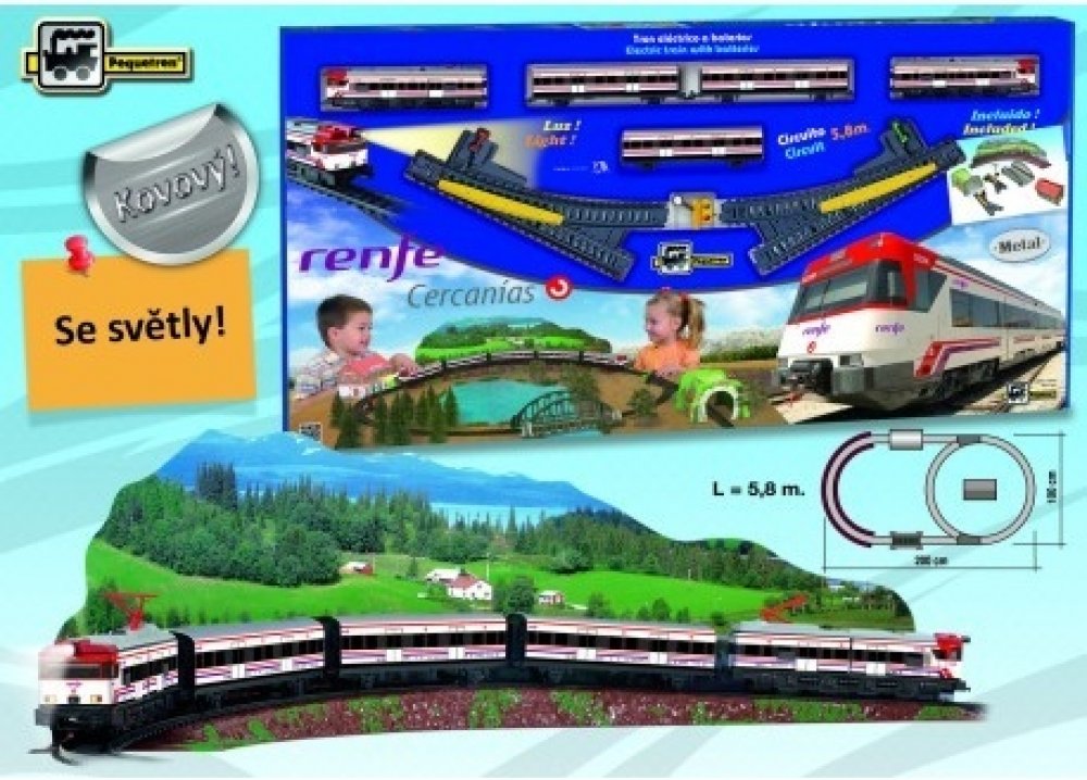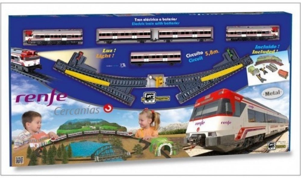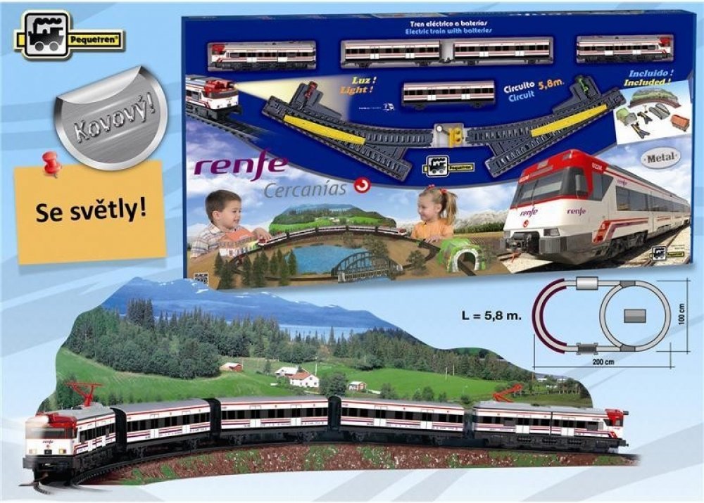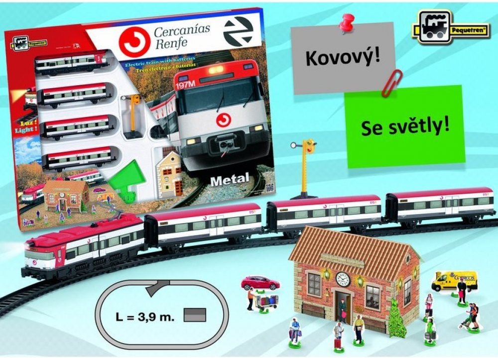Kovový osobní vlak na baterie se světly, 3 vagóny a železniční stanicí. Vlak jezdí po trati dlouhé 3,9 m. Cercanías je španělský osobní vlak provozovaný španělskou železniční společností Renfe.
