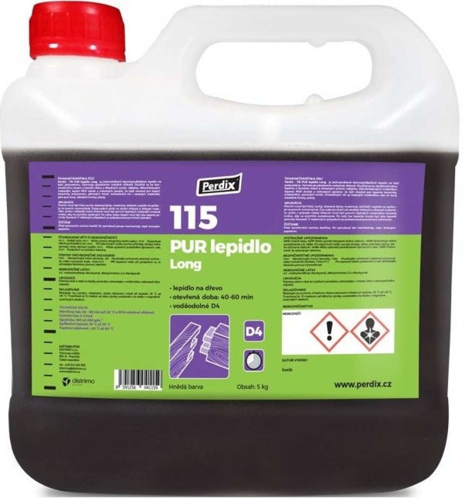 Perdix – 115 PUR lepidlo Long je jednosložkové bezrozpouštědlové lepidlo na bázi polyuretanu. Vytvrzuje působením vzdušné vlhkosti. Je trvale voděodolné D4 (ČSN EN 204). – Neobsahuje rozpouštědla – Lepidlo na dřevo – Otevřená doba: 40-60 min – Voděodolné D4 Pouze pro profesionální uživatele!Používá se ke konstrukčnímu lepení a lisování dřeva a dřevěných prvků, nábytku, dřevotřískových materiálů, lepení MDF desek a vrstvených panelů. Je také vhodné pro lepení keramiky, polystyrenu, pěnových hmot, minerálních vln i nesavých materiálů, jako jsou kovy, stavební hmoty, plasty. Není vhodné k výrobě konstrukčních zátěžových prvků pro stavební účely.