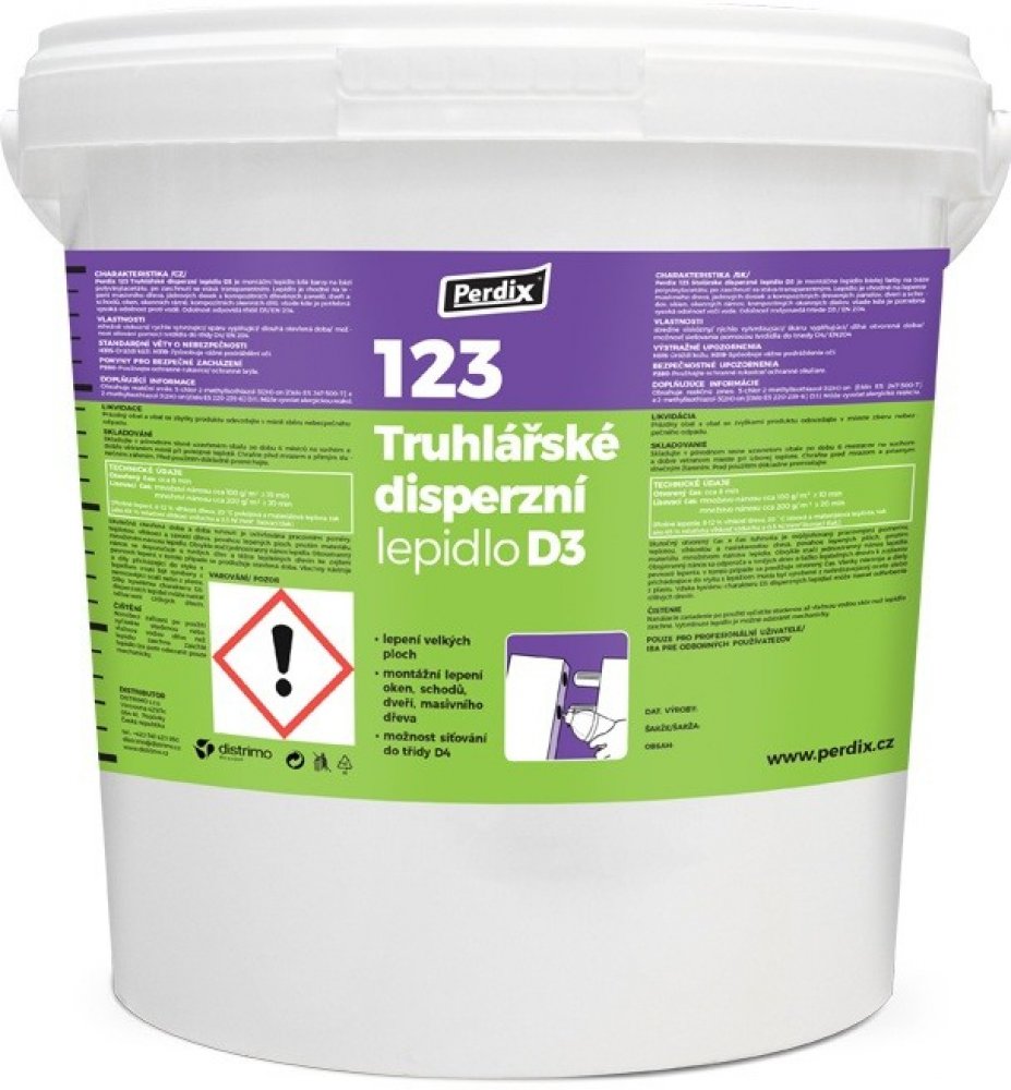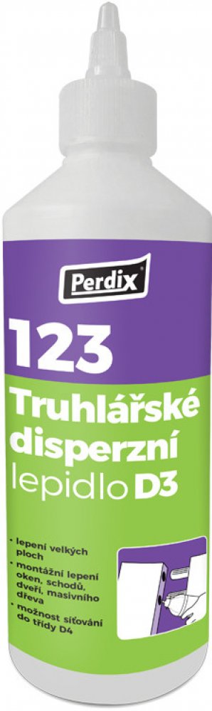 Perdix 123 truhlářské disperzní lepidlo D3 je montážní lepidlo bílé barvy na bázi polyvinylacetátu, splňující normu EN 204 pro odolnost vůči vodě třídy D3. Ideální pro lepení masivního dřeva, jádrových desek, kompozitních dřevěných panelů, dveří, schodů, oken, okenních rámů a kompozitních okenních dílů, kde je potřeba vysoká voděodolnost.