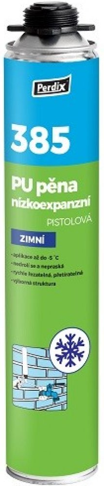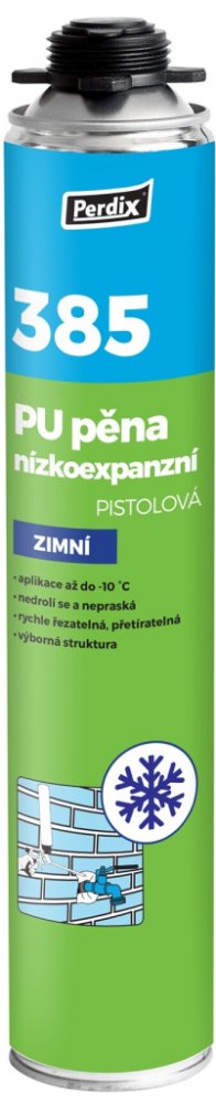 Perdix 385 PU pěna zimní nízkoxpanzní pistolová je montážní a izolační polyuretanová hmota, která díky speciální receptuře umožňuje aplikaci v nepříznivých klimatických podmínkách a při velmi nízkých teplotách pod bodem mrazu. Pěna nepraská ani se nedrolí během zrání, což zajišťuje efektivní instalaci a izolaci s vynikající adhezí ke všem stavebním materiálům. Je nepřilnavá k povrchům PE, PP, teflonu a silikonu. Vhodná pro montáž a utěsnění dřevěných, plastových a kovových rámů oken a vnějších dveří, ocelových a dřevěných zárubní a dalších konstrukcí. Lze ji použít k izolaci tepovodních rozvodů, bojlerů, chladírenských zařízení, koupelnových van a sprchových vaniček. Je také vhodná k utěsnění spár, prasklin a dutin, které nelze vyplnit jinými těsnicími materiály, nebo ke spárování roubených staveb.