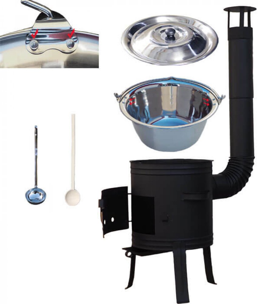 Kotlíková souprava obsahuje: Nerezový kotlík 10 L (0,8 mm) s nýty INOX. Objem: 10 L. Nerezová poklice. Žáruvzdorná nízká kotlina, průměr 33 cm 700 stp. Dřevěná vařečka, smrk. Velikost: 50 cm. Kvalitní nerezová naběračka INOX. Kotlíková souprava na outdorové vaření guláše a rybích polévek v přírodě, v zahradě nebo v otevřené kuchyně, především pro chalupáře, chataře, do kempu a na táboření.