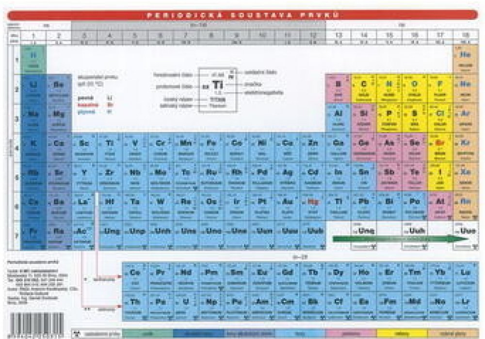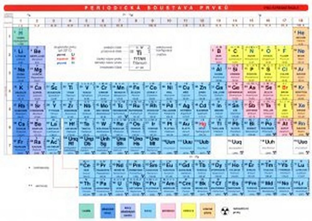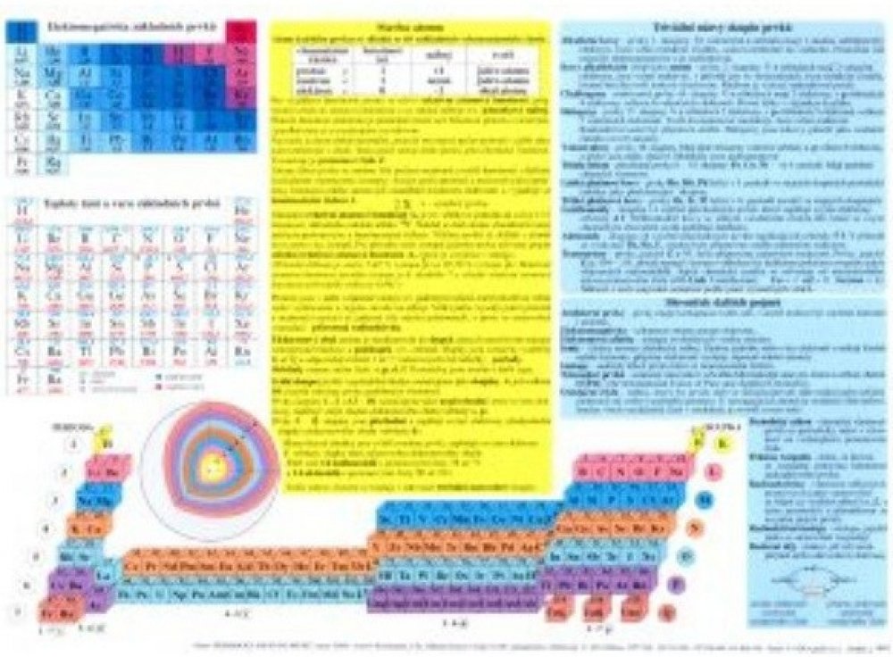 Určená pro základní školy. Nezbytná pomůcka při výuce chemie. Díky nižšímu množství údajů v tabulce dosahuje větší přehlednosti a čitelnosti. Periodická soustava prvků představuje současný počet objevených prvků uspořádaný do známé tabulky podle skupin a period. U každého prvku je uvedena jeho značka, oxidační číslo, hmotnostní číslo, protonové číslo, český a latinský název. Barevně označené je skupenství prvků, radioaktivita a rozlišení na kovy, alkalické kovy, kovy alkalických zemin, polokovy, nekovy a vzácné plyny. Druhá strana tabulky uvádí u prvků protonové číslo, značku, elektronovou konfiguraci a latinský název. Předností tabulky je vysvětlení struktury podle skupin a period. Na stavbě atomu a elektronovém obalu jsou graficky znázorněny a popsány slupky (vodorovné řady tabulky periody) a svislé sloupce prvků v periodické tabulce označované jako skupiny.
