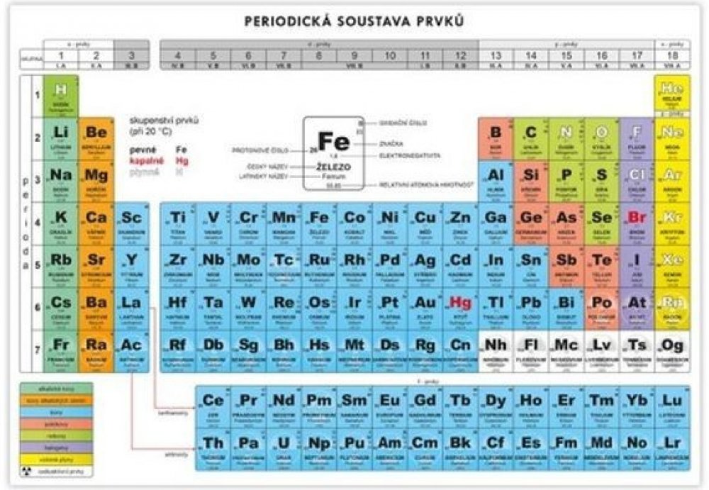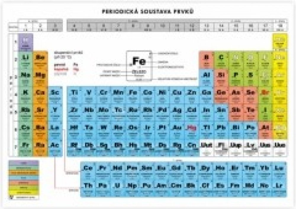 Periodická tabulka prvků - výuková tabulka. Vhodný doplněk k výuce chemie na základních a středních školách.Najdete zde chemickou značku prvku, český a latinský název, oxidační číslo, elektronegativitu, protonové číslo, hmotnostní číslo a elektronová konfigurace.
